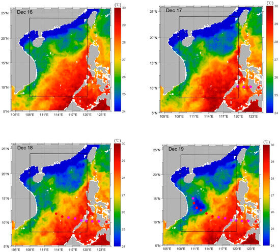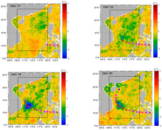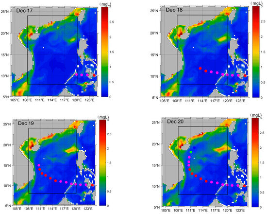 Figure 5 shows the wind stress curl distribution in the South China Sea during Typhoon Rey. Prior to the typhoon’s entry into the South China Sea, the regional average wind curl was −0.16 × 10−5. On the 18th, as the typhoon moved towards the southern part of the South China Sea, both wind speed and wind stress curl increased significantly within a radius of approximately 250 km from its center, reaching a maximum value of 2.89 × 10−5. On the following day (19 December), at the right side of the typhoon center, there was an intense positive wind stress curl with a maximum intensity of 9.35 × 10−5; meanwhile, on average across this region, a curl value of 4.36 × 10−5 was observed. Positive values for wind stress curl indicate upwelling phenomena, which can lead to subsurface water upwelling and consequent changes in marine elements on the sea surface [18].