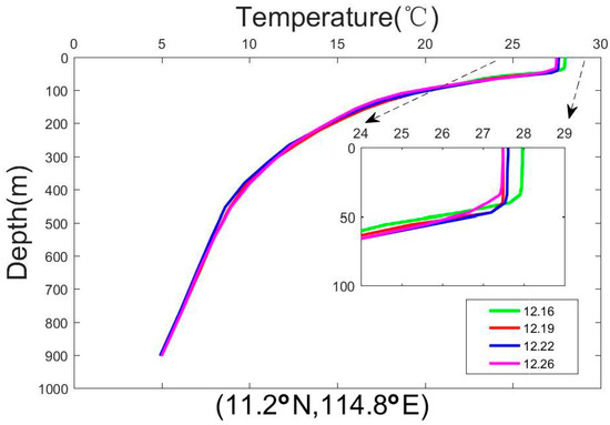 The distribution of changes in sea surface temperature (SST) at three profile breakpoints (11.2° N, 114.8° E; 12.5° N, 112.3° E; and 15° N, 110.6° E) within the thermocline was selected for analysis during different time periods: before, during, and after the typhoon event. Comparing the temperature variations among these three SST breakpoints revealed that the typhoon had a more pronounced impact on the subsurface ocean layer. Specifically, it enhanced vertical mixing effects primarily concentrated above −100 m depth in the subsurface region. Following the passage of the typhoon, a general decrease in SST was observed along both sides of its path. Influenced by Ekman pumping before and after the typhoon, the sea surface temperature (SST) experienced a decrease of approximately 1 °C (Figure 11), accompanied by an overall decline in thermocline temperature. The pre-typhoon distribution of thermocline SST ranged from 24 °C to 28 °C, whereas post typhoon it ranged from 21 °C to 25.5 °C. This reduction in SST can be attributed to the mixing of cold bottom water with surface water induced by the typhoon’s action, leading to a subsequent decrease in SST. The mixing effect primarily impacted SST between −40 m and −100 m deep as well as within the thermocline layer spanning −60 m to −80 m deep, with more pronounced cooling observed at greater depths. Following the typhoon event, there was a gradual recovery in sea surface temperature over a period of 3–5 days. According to the profile map, during the transit of the typhoon, the upper ocean was significantly affected by the cold suction mechanism, the sea surface temperature dropped, and the deeper seawater showed a state of uplift. The Ekman pumping effect caused by the typhoon led to upwelling, which lifted the deeper cold seawater to the sea surface, and the seawater rose most obviously on 22 December. This is because the rising and mixing speed of the seawater was much slower than the moving speed of the typhoon, so the mixing performance of the seawater pumped by Ekman pumping lagged behind. The sea surface temperature (SST) gradually recovered on the 26th due to the influence of sea air and solar radiation, whereas the SST in the thermocline at a depth of 40–80 m remained higher than its initial value. The heat pump mechanism, driven by seawater mixing caused by the typhoon, led to warm water sinking and cold water rising, resulting in an anomalously warm subsurface state. A similar heat pump phenomenon was observed on the 19th at 12.5° N, 112.3° E and 15° N, 110.6° E; however, it was quickly overshadowed by strong cold suction [25]. On both 19 and 26 December, a more pronounced heat pump effect occurred at profile positions 11.2° N and 114.8° E, leading to a slight increase in sea surface temperature (Figure 13).