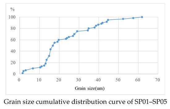 In the upstream (SP01–SP05), (1) the fine-grained sediments are mainly composed of silty loams, with an average grain size of 22.94 μm, and a downward trend from SP01 to SP05; (2) the average permeability coefficient is 1.42 m/d, belonging to medium permeability and showing an upward trend from SP01 to SP05; (3) the average cohesion is 24.3 kPa, showing a decreasing trend from SP01 to SP05 (Figure 5), and the average internal friction angle is 19.87°, showing an upward trend from SP01 to SP05 (Figure 6); (4) the cumulative distribution pattern of grain size (Figure 8) shows inflection points at 10, 20, and 30 μm, indicating poor sorting characteristics. On-site photos (SP01–SP05, Figure 8) also confirm the above conclusion: soils at SP01 are in a plate condensed state with the characteristics of high cohesion and strong erosion resistance. However, the following photos of SP02–SP05 show that the sediments are loosely accumulated, indicating low cohesion and high permeability. Therefore, for SP01 to SP05, we draw a conclusion that the soil’s ability to resist water flow erosion becomes strong to weak, resulting in the risk of debris flow disasters becoming weak to strong.
