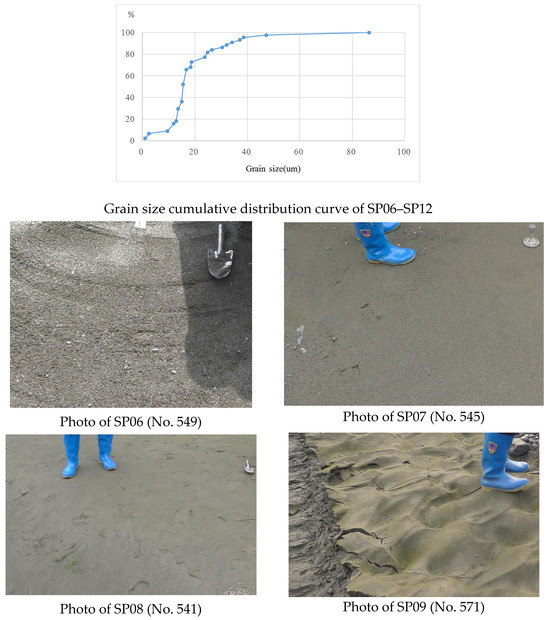 Cumulative grain size distribution curve and field photos of fine-grained sediments in midstream river (SP06-SP12).
