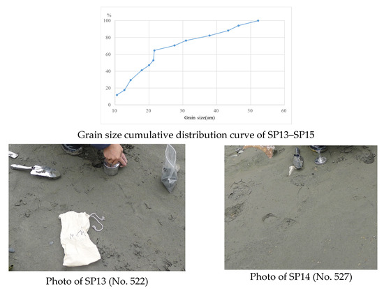 Cumulative grain size distribution curve and field photos of fine-grained sediments in downstream river (SP13–SP15).
