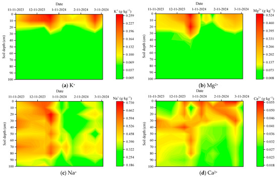 The variations in cations and anions during the freeze–thaw period are shown in Figure 5. Na+, Cl−, and SO42− were widely distributed at the depth of 0–100 cm, with concentrations of 0.19–0.73 g·kg−1, 0.02–0.36 g·kg−1, and 0.09–0.80 g·kg−1, respectively. Mg2+ and K+ were predominantly concentrated at the depth of 0–40 cm (0.02–0.52 g·kg−1 and 0.01–0.26 g·kg−1), which is attributed to the high organic matter content from residual maize roots post-harvest, which enhanced CEC and promoted the surface accumulation of Mg2+ and K+ [43]. Additionally, Mg2+, with its large ionic radius and positive charge, exhibited strong adsorption onto soil colloids in silt-rich layers [44], resulting in Mg2+ concentrations at the depth of 0–40 cm being approximately 7-fold higher than those at the depth of 40–100 cm (Figure 5a,b). HCO3− was primarily distributed at the depth of 0–60 cm (0.56–2.38 g·kg−1), while Ca2+ showed uniform but low concentrations (0.02–0.05 g·kg−1) throughout the entire profile.