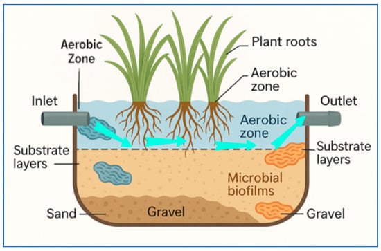 The increasing global water crisis intensifies the urgent need for sustainable and cost-effective wastewater treatment technologies that can address current demands as well as future environmental challenges [,]. Conventional water treatment systems face challenges from rising energy costs, complex operational requirements and emerging contaminants, highlighting the need for natural and sustainable approaches []. Constructed wetlands are a probable solution []. Constructed wetlands have gained prominence as viable alternatives that harness natural processes for comprehensive water purification []. The microbial ecology of constructed wetlands encompasses an immense diversity of bacteria, archaea, fungi and other microorganisms that collectively orchestrate pollutant degradation, nutrient cycling and ecosystem functioning across various spatial and temporal scales []. These engineered ecosystems represent a paradigm shift toward nature-based solutions that merge ecological principles with engineering design to create controlled environments optimised for pollutant removal []. Constructed wetlands function through synergistic interactions between three primary components: macrophytic vegetation, substrate media and diverse microbial communities []. Among these components, microbial communities serve as the biological engines driving the complex biogeochemical transformations essential to effective water purification []. An ideal constructed wetland for cleaning wastewater is shown in Figure 1.