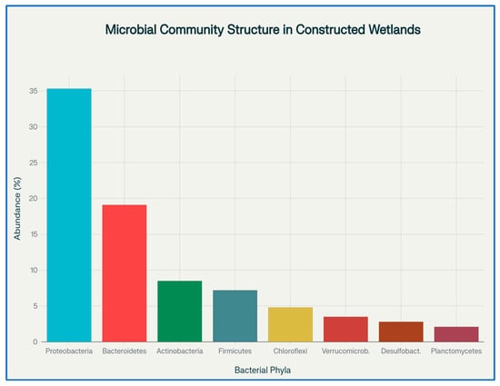 The taxonomic dominance of bacterial populations reflects the metabolic versatility required to process diverse pollutants and the adaptation to the dynamic environmental conditions characteristic of constructed wetland systems. The microbial communities in constructed wetlands exhibit remarkable diversity and complexity. The bacterial populations in constructed wetlands are typically dominated by different major phyla (Figure 2), which collectively account for 60–80% of total bacterial abundance across different wetland configurations and operational conditions [].