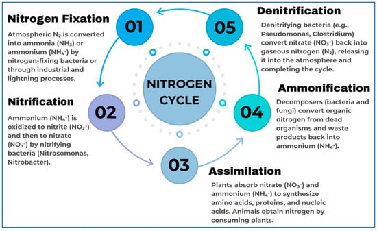 Denitrification is the dominant nitrogen removal process in constructed wetlands, in which nitrate is stepwise reduced to nitrogen gas under anaerobic conditions []. Denitrification is a distinct metabolic process that requires organic carbon as an electron donor and proceeds through successive reduction steps mediated by different bacterial communities, and it also depends on the availability of suitable electron donors, which may limit denitrification efficiency in constructed wetlands []. A feature of denitrifying bacteria is their pronounced metabolic flexibility, with plant exudates, dead plant material, and wastewater organic compounds among the best carbon sources []. Denitrifying bacteria are diverse, and some, such as those in the genera pseudomonas, paracoccus or thauera, are facultative anaerobes that allow complete denitrification of nitrates to nitrogen gas []. The complete nitrogen cycle is shown in Figure 3. All the Nitrogen removal mechanisms and key microbial players are shown in Table 2.