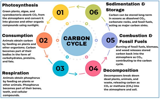 Carbon cycling in constructed wetlands involves complex interactions between autotrophic and heterotrophic microbial processes that determine the fate of organic matter and affect overall system performance []. Due to the diverse carbon sources and metabolic flexibility of microbial communities, constructed wetlands efficiently treat various organic pollutants and play an essential role in carbon sequestration. Specifically, aerobic organic matter degradation primarily occurs in well-aerated regions, where heterotrophic bacteria utilise dissolved oxygen as the terminal electron acceptor for rapid and complete mineralisation of biodegradable organic compounds []. Initial treatment stages are critical for the removal of indicators like biochemical oxygen demand (BOD) and chemical oxygen demand (COD), in which several aerobic bacteria, such as pseudomonas and acinetobacter, play an essential role in organic matter degradation []. In oxygen-limited zones, anaerobic degradation pathways predominate, with sequential fermentation, acetogenesis and methanogenesis steps []. Fermentative bacteria break down more complex organic compounds into less complex organic acids and alcohols, and acetogenic bacteria convert these intermediates to acetate to be used for methanogenic archaea []. Efficiency is based on interspecific product exchange between groups in a syntropic association and on environmental regulation. Specialised degradation pathways enable constructed wetlands to eliminate recalcitrant organic compounds and emerging contaminants by sustaining a unique population of bacteria that can degrade pharmaceuticals, pesticides and industrial chemicals []. Specialised degraders are often minor players in the community but have a disproportionate effect on removing certain pollutants that conventional treatment pathways cannot remove []. Carbon cycle illustrating the flow of carbon through the environment is shown in Figure 5.