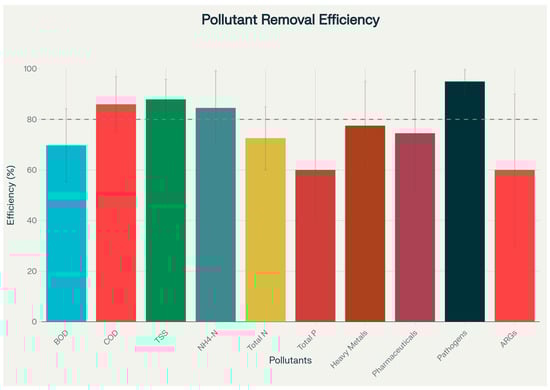 The integrated physical, chemical and biological operations of wetlands for the treatment of different pollutants are driven mostly by microbial activities []. In summary, the different elimination mechanisms that constructed wetlands rely on give these systems an advantage in treating complex wastewaters contaminated by multiple classes of chemical pollutants. The multi-faceted approach to pollutant removal makes constructed wetlands particularly effective for treating complex wastewaters containing multiple contaminant classes []. Pollutant removal efficiency ranges achieved by constructed wetland systems for major contaminant categories (Figure 6).