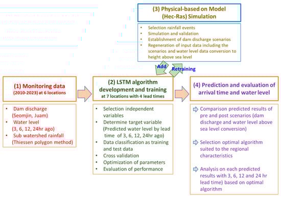 The ultimate goal is to advance the model to a practical level, enabling the prediction of river water levels and arrival times of dam discharges. This study aimed to predict the water level caused by dam discharges at major monitoring stations along the Seomjin River Basin in South Korea. Specifically, LSTM algorithms were developed for lead times of 3, 6, 12, and 24 h to forecast the river water levels associated with dam discharges by utilizing a variety of hydrometeorological datasets. Furthermore, input data optimization and enhanced input variables, including hybrid model data within an AI system, were conducted to evaluate and enhance the achieved predictive accuracy (Figure 1).