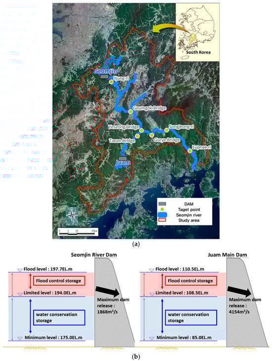 Target points of this study in the Seomjin River Basin: (a) locations of the water level stations in the study area; (b) maximum dam release points (for the SRD and JMD).