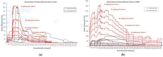 Synthetic hydrological dataset of dam release with observed and scenario data: (a) SJD and (b) JMD.