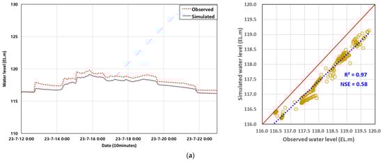 The validation period for the SRD was from 12 July to 23 July 2023, with a maximum dam discharge of 692.29 m3/s. The validation sites were Imsil-gun (Iljung-ri) and Gurye-gun (Gurye Bridge). For the Bosung River, validation was performed using the maximum dam discharge of 395.67 m3/s at Moksadong 1 Bridge during 9–20 August 2023. This site was additionally used only for calibrating the HEC-RAS modelling results. Because unsteady flow analysis requires lateral inflow data, observed flow records were applied to generate inflows for subcatchments. Differences between simulated and observed water levels were minimized by adjusting Manning’s roughness coefficients (Figure 4). For all three calibration and validation sites, the model performance was satisfactory, with R2 values above 0.94 and NSE values above 0.50, and the validated results were subsequently used to construct additional scenario input datasets.
