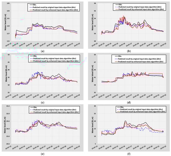Evaluation of the prediction performances achieved by two algorithms based on different input data types during the hold-out test period. (a) Imsil-gun (Iljung-ri); (b) Gokseong-gun (Geumgok Bridge); (c) Gokseong-gun (Yesung Bridge); (d) Gokseong-gun (Taean Bridge); (e) Gurye-gun (Gurye Bridge); (f) Gurye-gun (Songjeong-ri).
