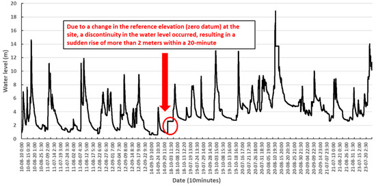Figure 6 illustrates the river stage at the Songjeong-ri station in Gurye-gun, which was used in this study. At this location, the reference elevation (data) changed during the observation period, which altered the base water level (m). If such shifts are not corrected during the learning process, the aforementioned issues can arise. Therefore, while incorporating a wide range and volume of input time series data is valuable, ensuring the consistency of variables that reflect the same physical property is a critical step for improving the performance of models and ensuring their prediction reliability. Ultimately, this study proposes that for achieving accurate river stage forecasting under dam release scenarios, optimizing the utilized algorithm requires not only the use of consistent input data but also the consideration of site-specific river topography parameters—such as the travel time, distance, and compound effects of dam releases—along with appropriate hyperparameter tuning. These considerations collectively contribute to the establishment of a generalized modeling strategy that balances physical interpretability with data-driven flexibility. This balance is essential for developing robust, scalable, and operationally reliable AI-based flood forecasting systems.