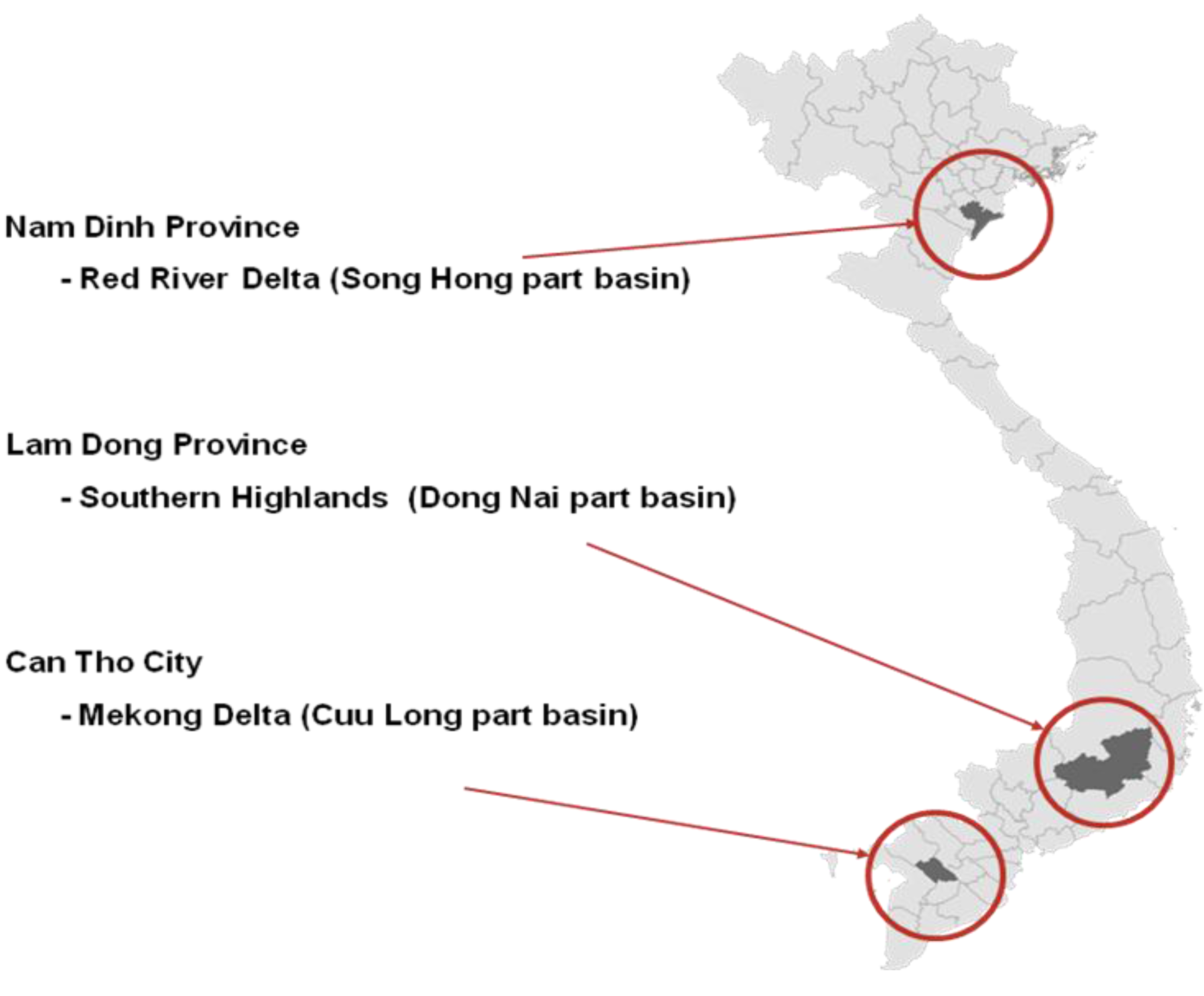 The research focuses on the development and application of Planning and Decision Support Tools to improve the IWRM in three different regions of Vietnam: the upper Dong Nai river basin (Province Lam Dong), the Red River sub basin (Province Nam Dinh) and the Mekong sub basin (City Can Tho; see Figure 1). These provinces are located in very different natural and geographical settings and represent the diversity of Vietnamese nature, people and economy.