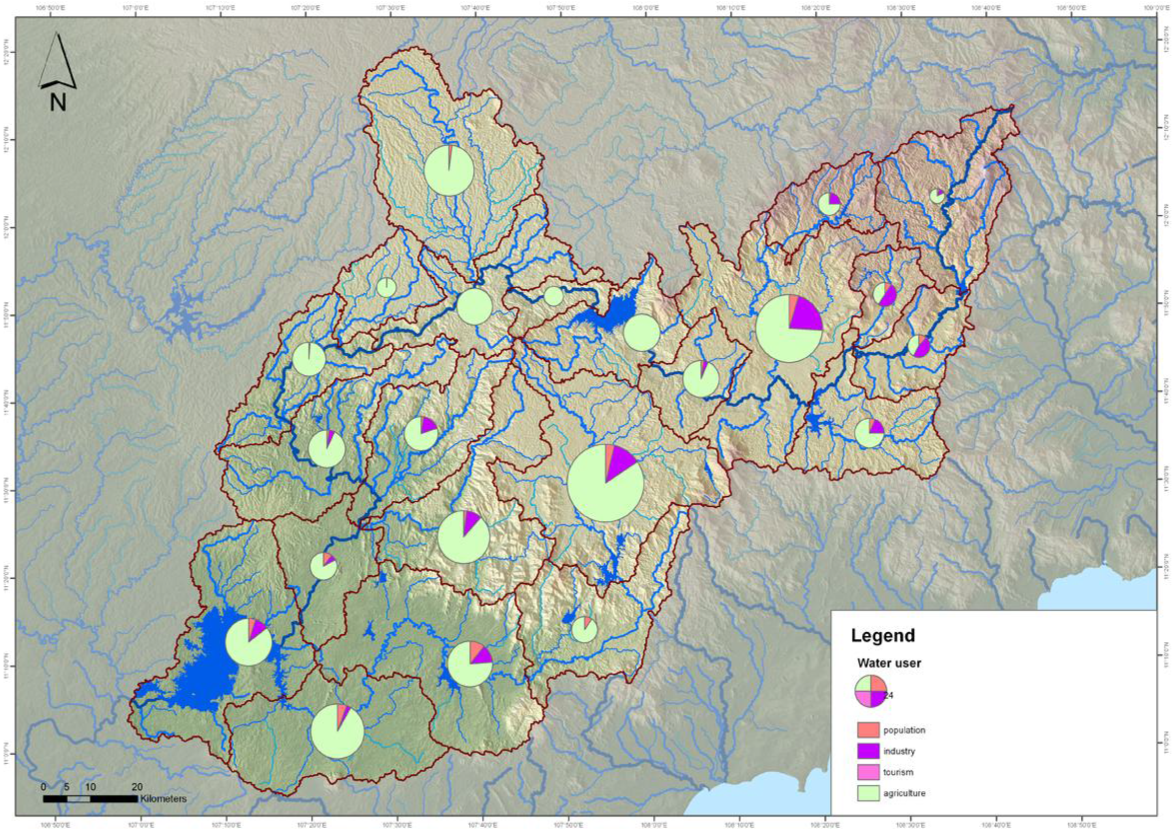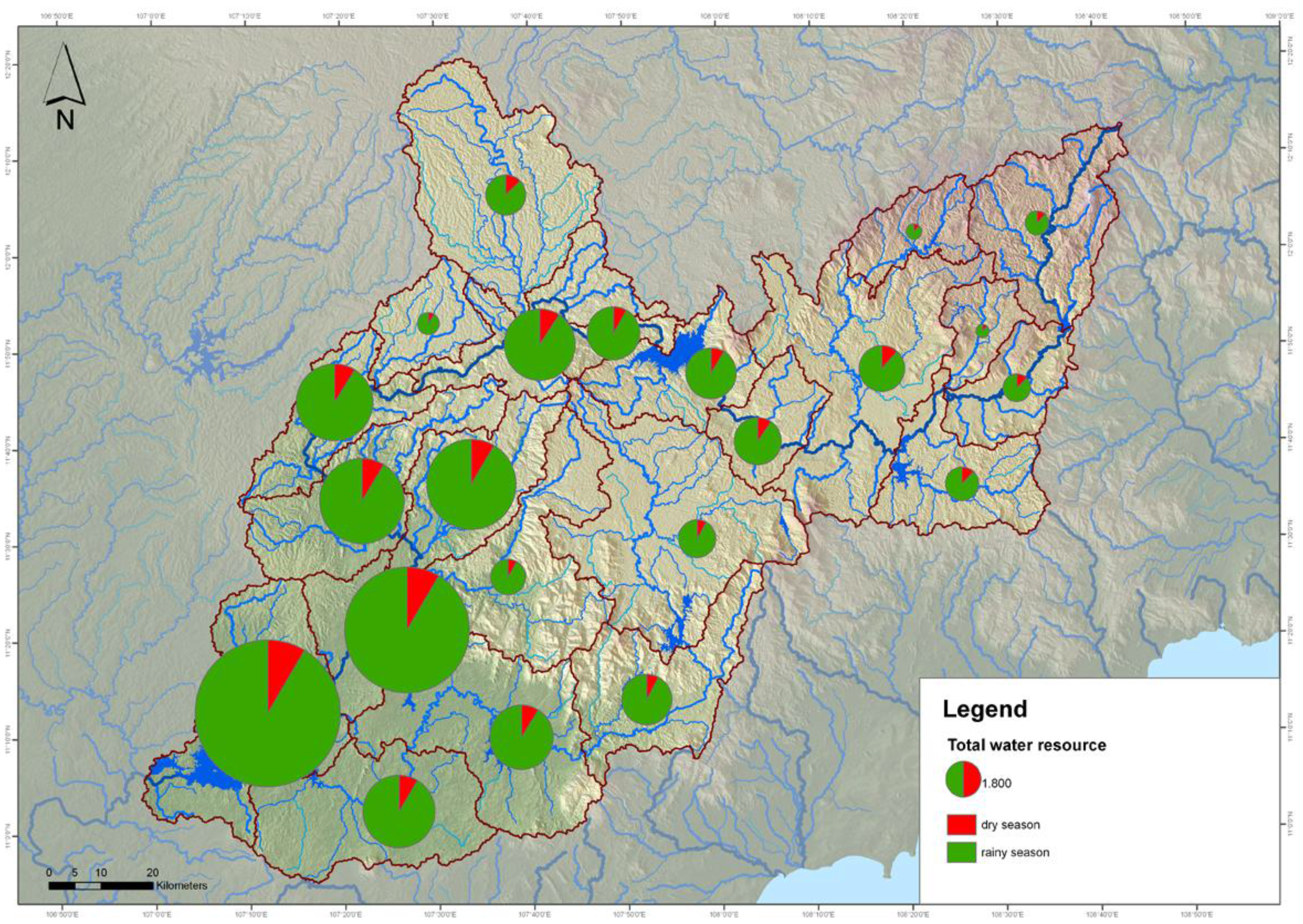 Figure 6 shows the amount of water resource for each WMU. The red lines symbolize the WMU borders; the green segment of the pie chart represents the amount of water resources for the rainy season (unit: million m3); the red part of the pie chart represents the amount of water resources for the dry season (unit: million m3).