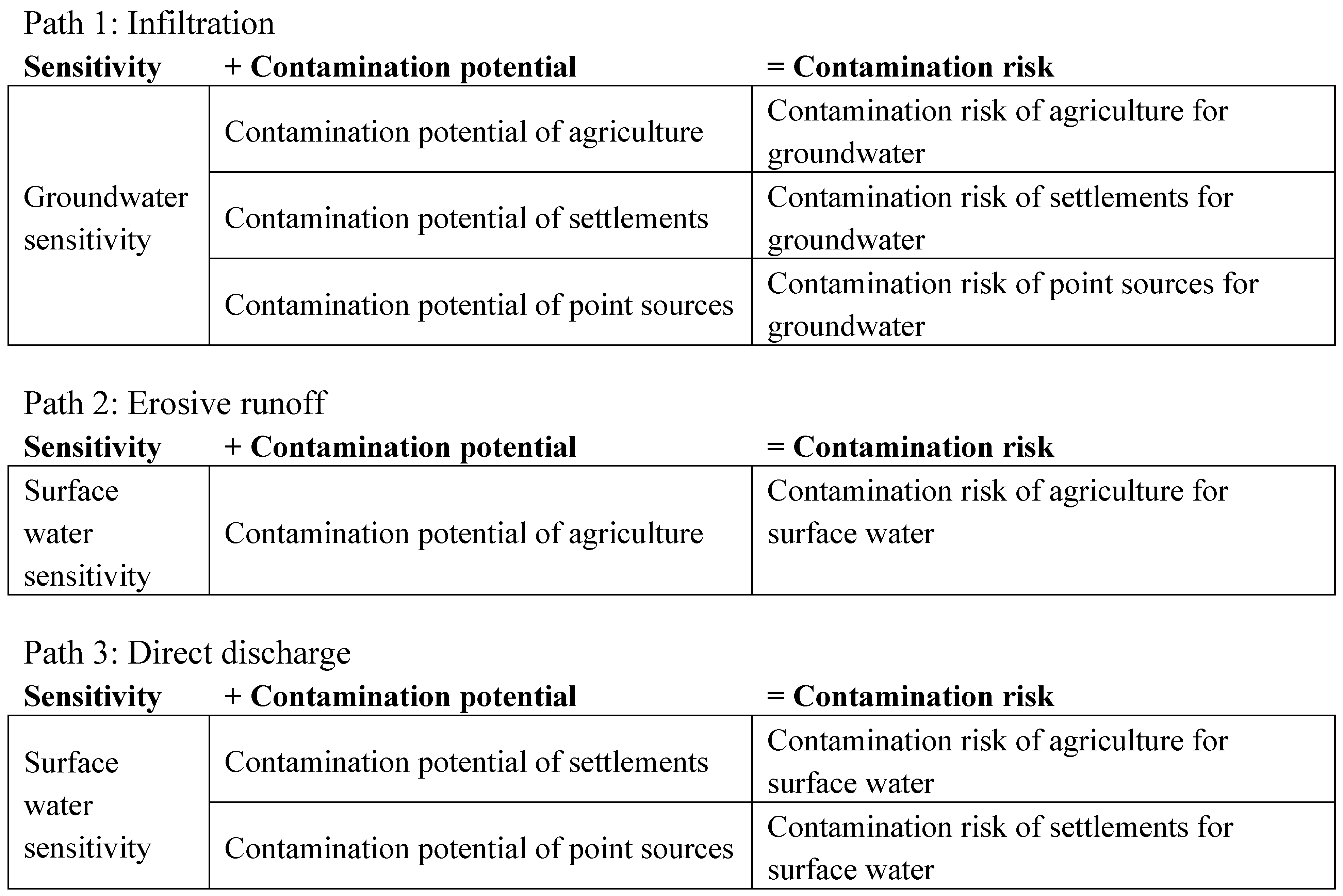 sensitivity of water resources + contamination potential of pollutants = contamination risk