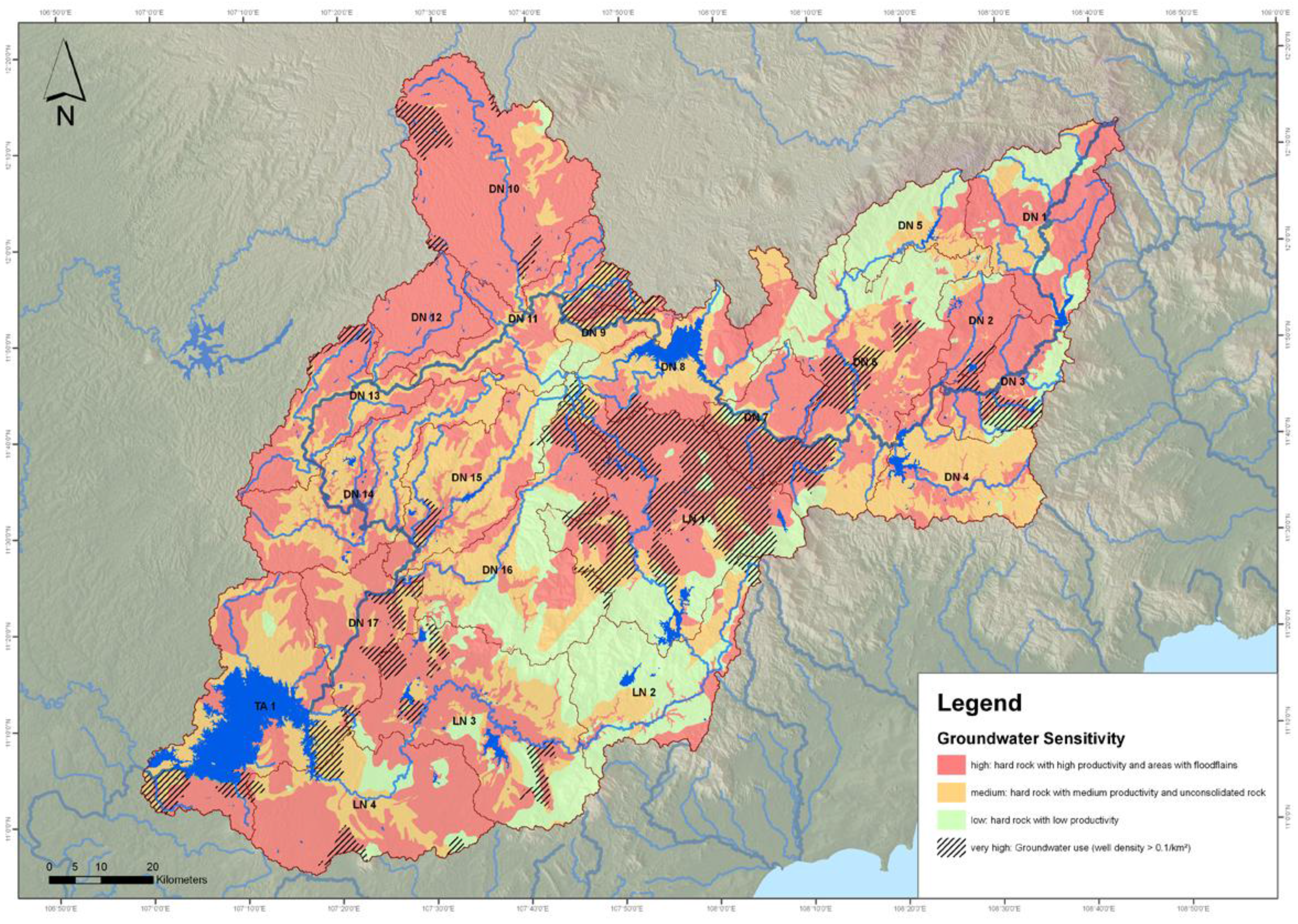 The parameters for the determination of the sensitivity of groundwater (path 1), on the river basin scale, are the result of aquifers and groundwater use. Aquifers with a high sensitivity are hard rock with a high productivity or floodplains (Figure 10: red color, essentially basalt rock). Aquifers with a medium sensitivity are hard rock with a medium productivity (Figure 10: orange color, essentially sedimentary rock) and those with a low sensitivity are hard rock with low productivity (Figure 10: green color, essentially granite rock). Regions with groundwater use and a higher relevance for water supply are set to a very high sensitivity per se (Figure 10: hatched areas).