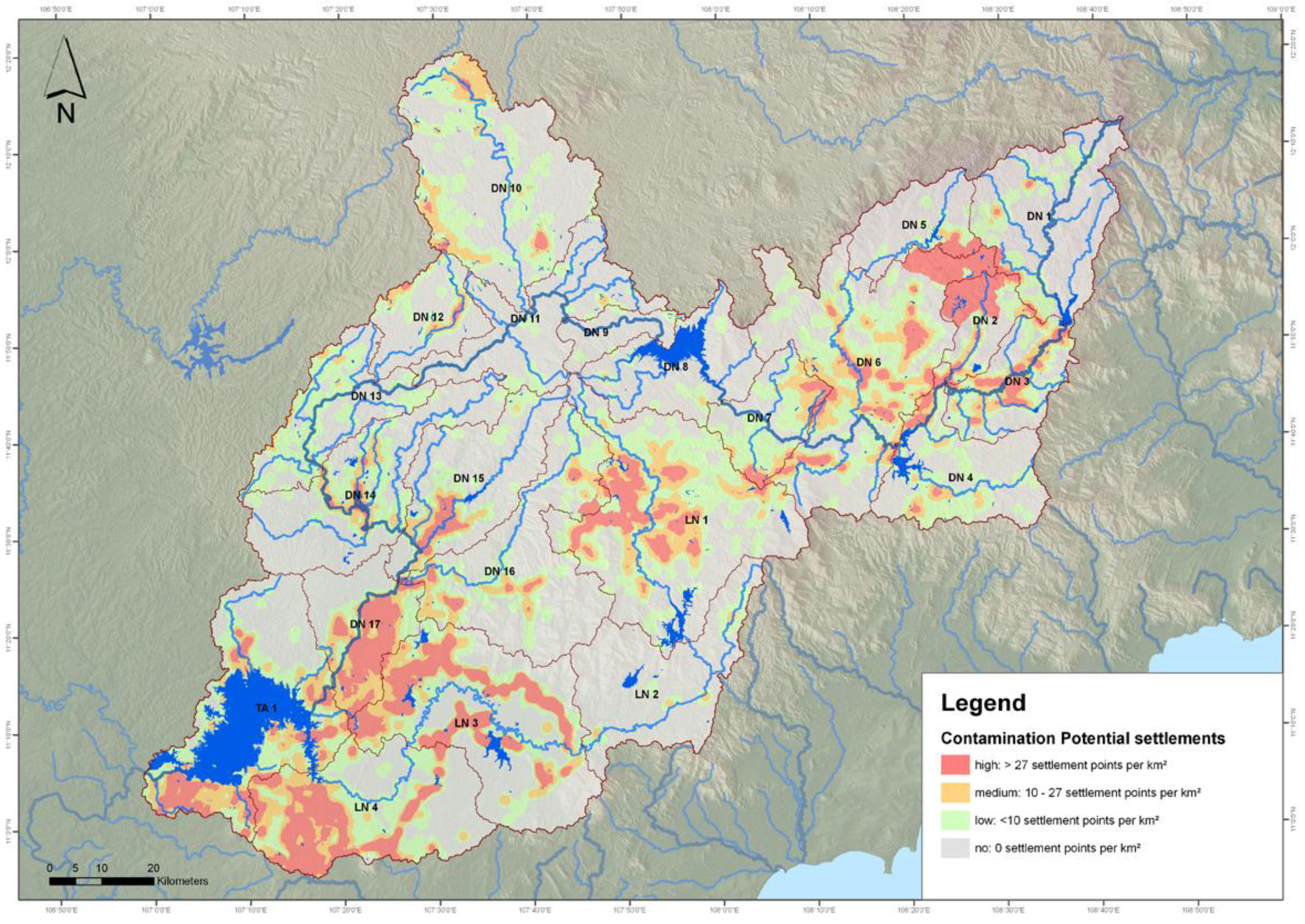 The contamination potential of settlements is relevant for path 1, because with the exception of one sewage plant in the province capital Dalat, there are no other treatment facilities. Most of the domestic wastewater reaches the groundwater. Figure 11 shows the density and distribution of settlements within the river basin. A high settlement density (>70 settlement points/km2) is shown in red, a medium settlements density (31–70 settlement points/km2) in orange, a low settlement density (5–30 settlement points/km2) in green, and no settlement contains areas with less than five settlement points/km2. The distribution of settlements shows areas where domestic wastewater can reach the groundwater. Population data is available on district level only. Therefore, the settlement building data is used to calculate a settlement density map.