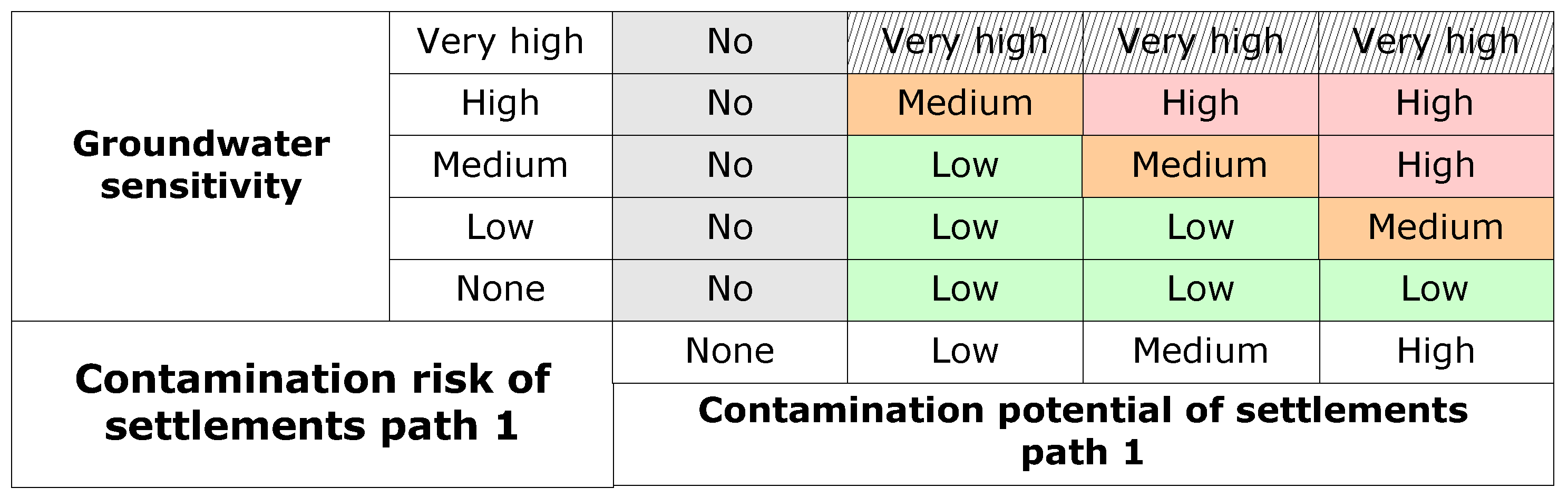 The aggregation of groundwater sensitivity, and the contamination potential of settlements to contamination risk, is carried out using the aggregation matrix shown in Figure 12. Its aim is to classify the contamination risk into three general classes (low, medium, high).