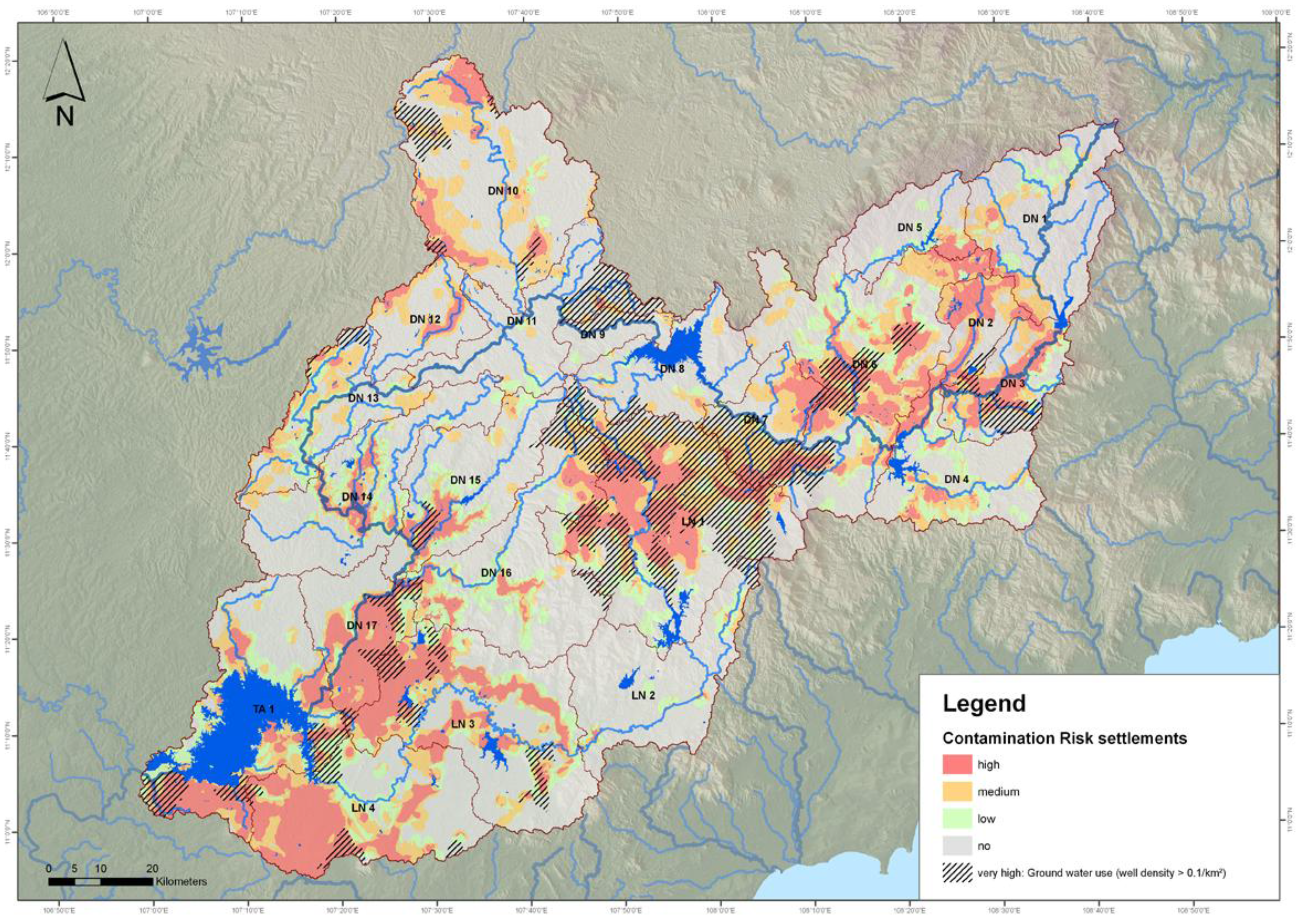 Figure 9 shows the interrelation between sensitivity of water resources, the possible causes of contamination potentials, and the resulting contamination risks for all three contamination paths. In view of the large number of thematic maps per research area (i.e., 15) created within the Contamination Risk Tool, only examples for the Dong Nai river basin are presented within this article. The example shows the method of assessing the groundwater sensitivity, the contamination potential and the contamination risk of settlements.