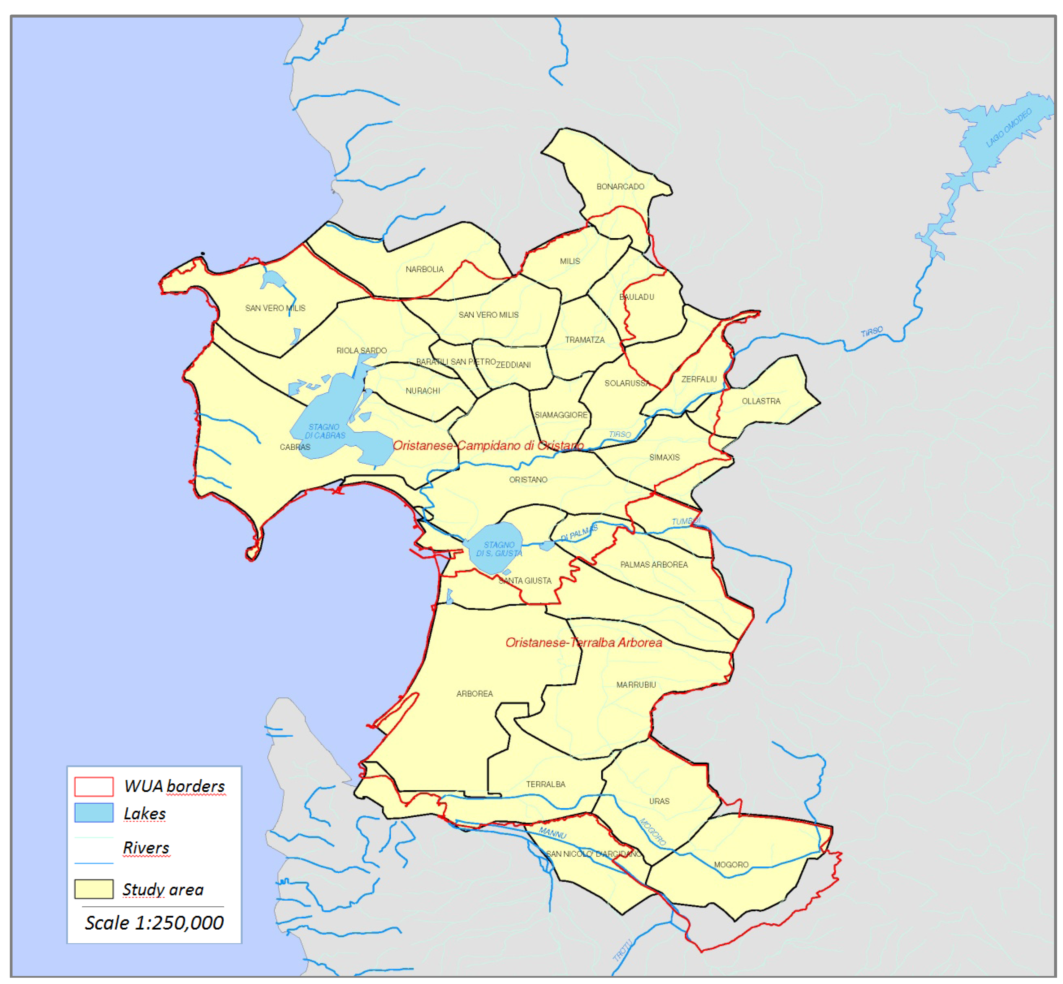 The study area in western Sardinia (Italy), showing the borders of the irrigation districts. Source: [10].