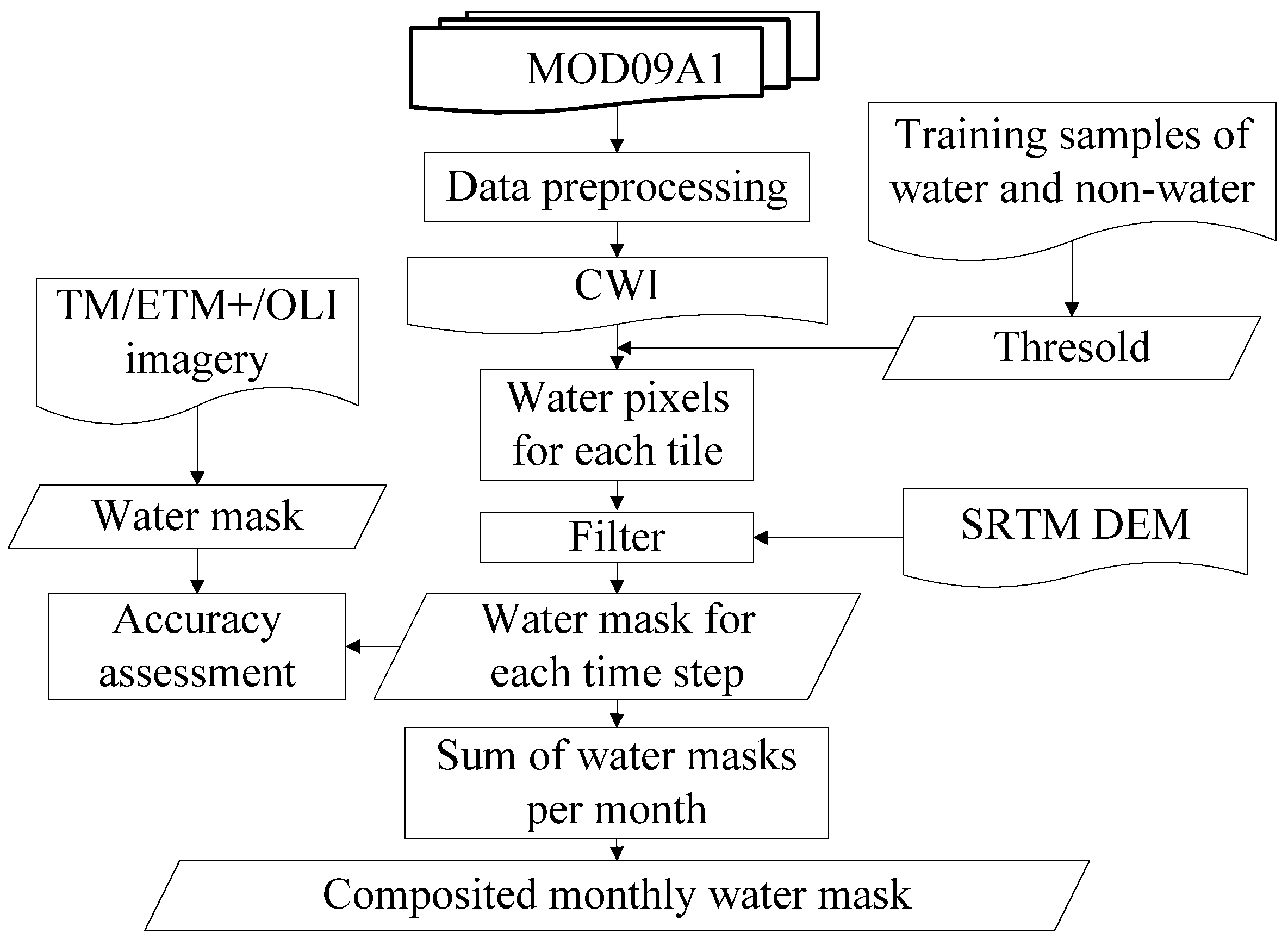 where b1, b2, and b7 represent the reflectance of band 1 (Red band, 620–670 nm), band 2 (NIR band, 871–876 nm), and band 7 (SWIR band, 2105–2155 nm) of the MOD09 data, respectively. A and C are correction factors to adjust the data ranges of CWI values. They are empirically determined by comparing CWI values between water pixels and background in the study area. We set A as 0.4 and C as 100 in our study [19]. Figure 2 illustrates the procedure for extracting water bodies based on MODIS data.
