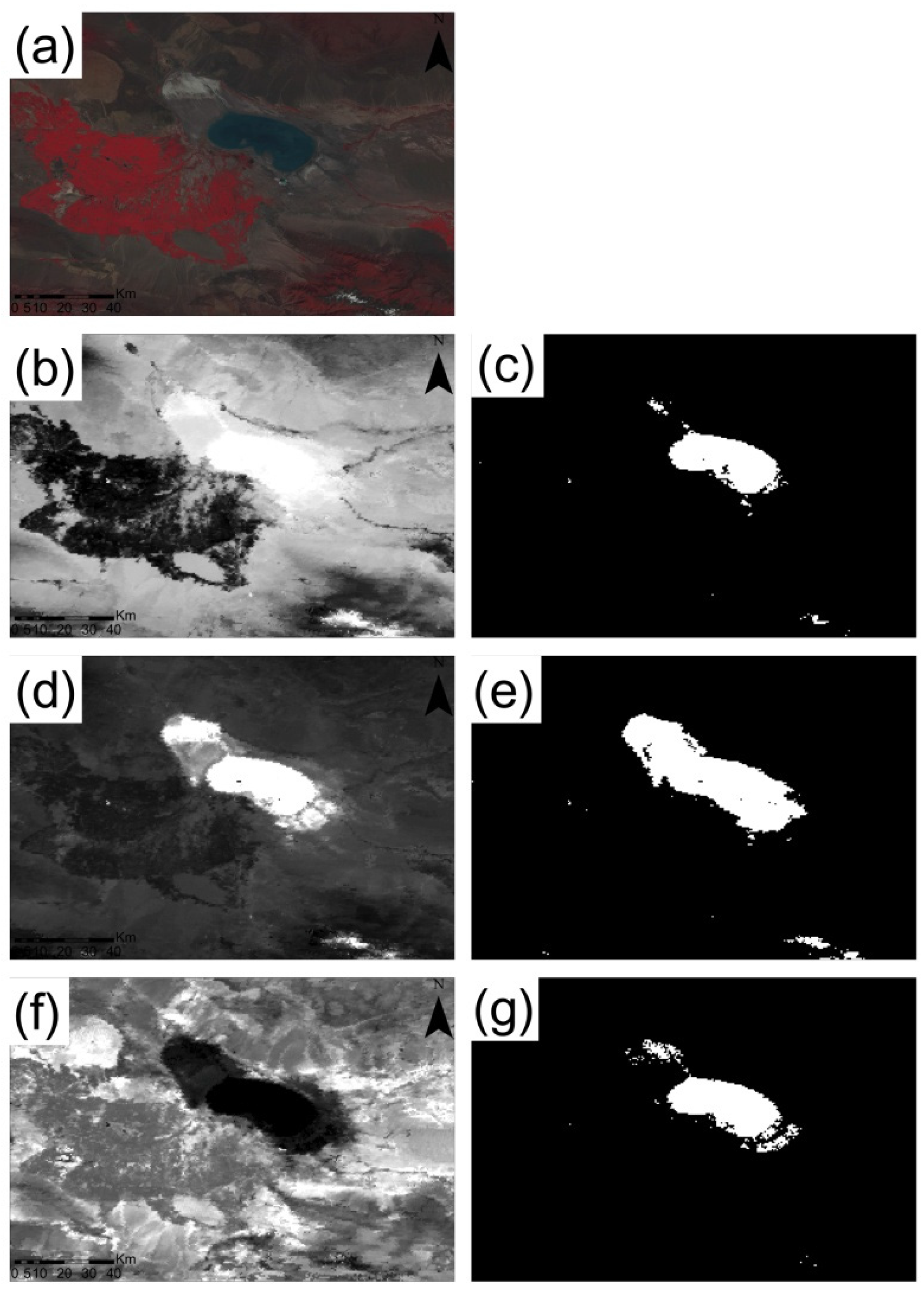 The water body mapping results of the Ebinur Lake using NDWI, MNDWI, and CWI from MODIS data were compared in Figure 3. The spectral response of water is very similar to bare lands around the lake for NDWI (Figure 3b). For MNDWI, the spectral signatures of dried-up lake and snow at the lower right of the image are identical with water pixels (Figure 3d). We applied a threshold value of zero to extract water pixels from the NDWI and MNDWI images [18]. The mapping result from NDWI shows an obvious underestimation of the lake surface area (Figure 3c). An overestimation of lake surface area is observed from the MNDWI results (Figure 3e). Comparing with water bodies extracted from NDWI and MNDWI visually, the water pixels identified from CWI have higher accuracy (Figure 3g).