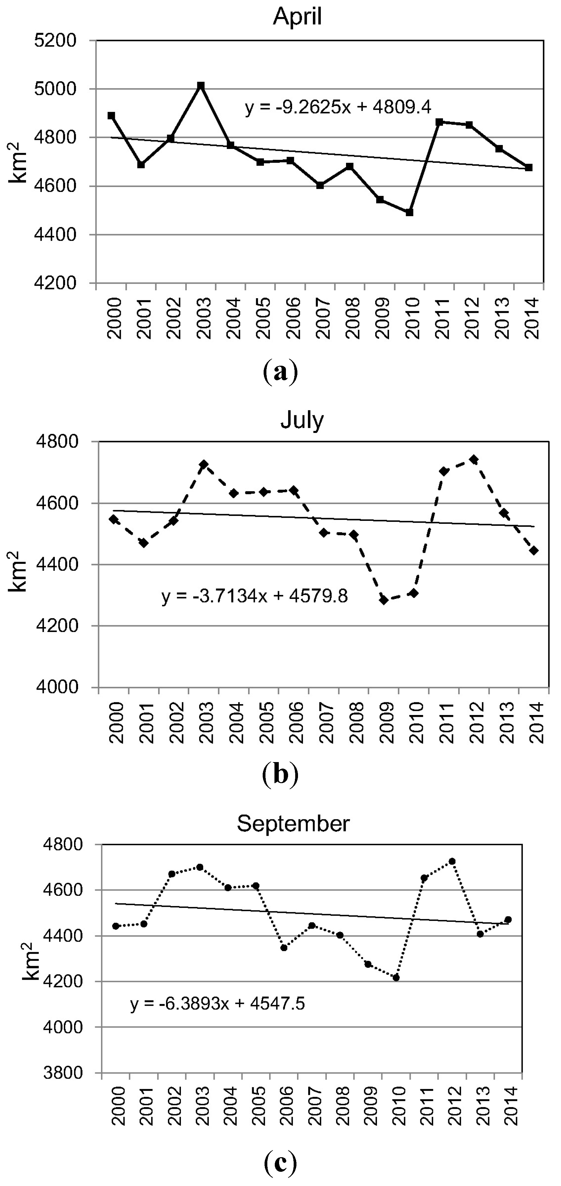 We calculated the total area of 10 large lakes and analyzed their intra- and inter-annual dynamics in XUAR. Their total surface area varied from 4217 km2 (September 2010) to 5014.75 km2 (April 2003), with high seasonal variability. The largest surface area is usually in April and the smallest value in September. A decreasing trend of total lake surface area can also be observed for all three months from 2000 to 2014, even though the trend is insignificant with a 0.1 significance level (Figure 4). Significant shrinking trends were found for April (34.65 km2/year), July (22.91 km2/year), and September (31.02 km2/year) from 2000 to 2010 with a 0.1 significance level.