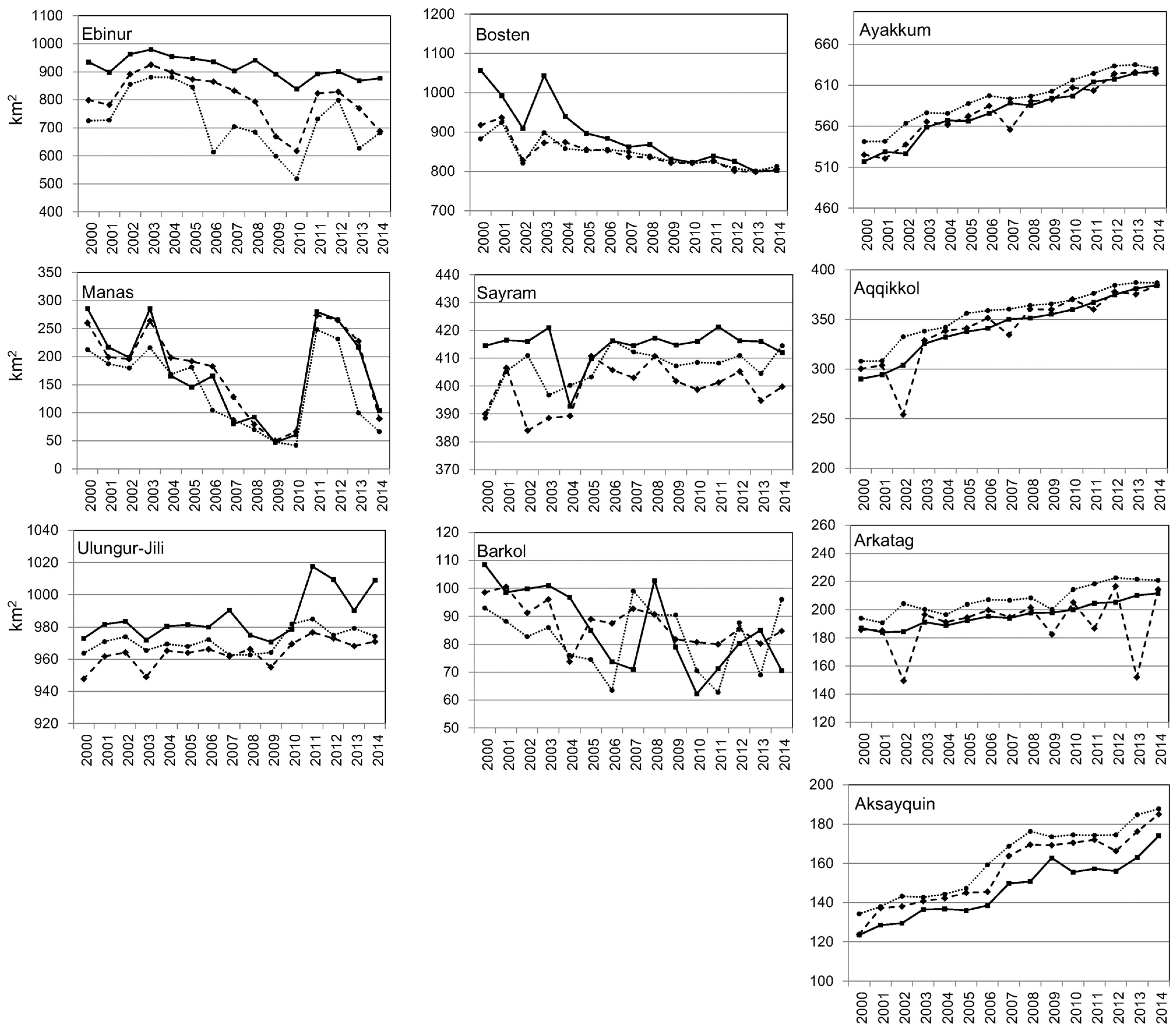 Inter-annual variation in the surface area of major lakes for the months of April, July, and September in XUAR from 2000 to 2014. Solid, dashed, and dotted lines represent April, July, and September, respectively.