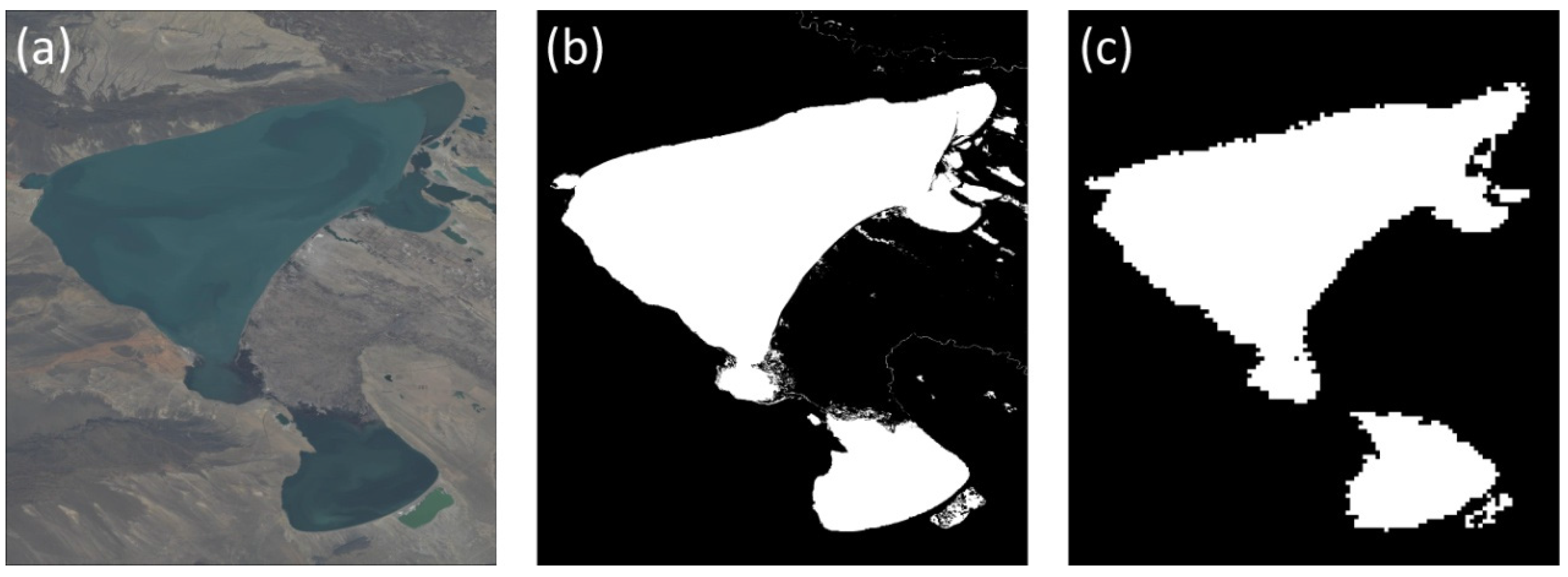 Comparison of a water body derived from MODIS data and Landsat for April 2014, Ulungur Lake. (a) Landsat image; (b) water mask derived from Landsat data; and (c) water mask derived from MODIS data.