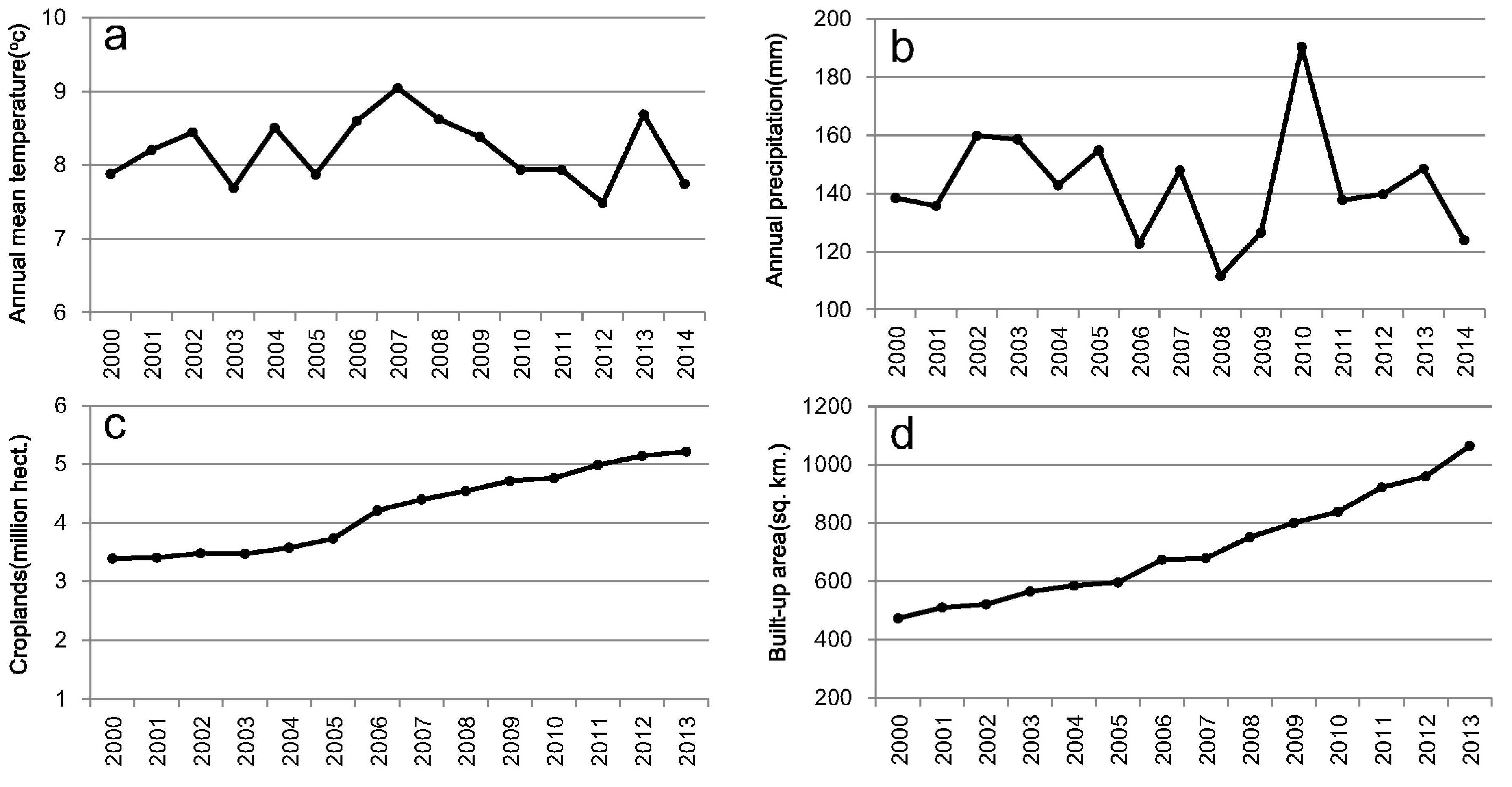 Variations in (a) annual mean temperature; (b) annual precipitation; (c) area of croplands; and (d) built-up areas in XUAR over the study period.