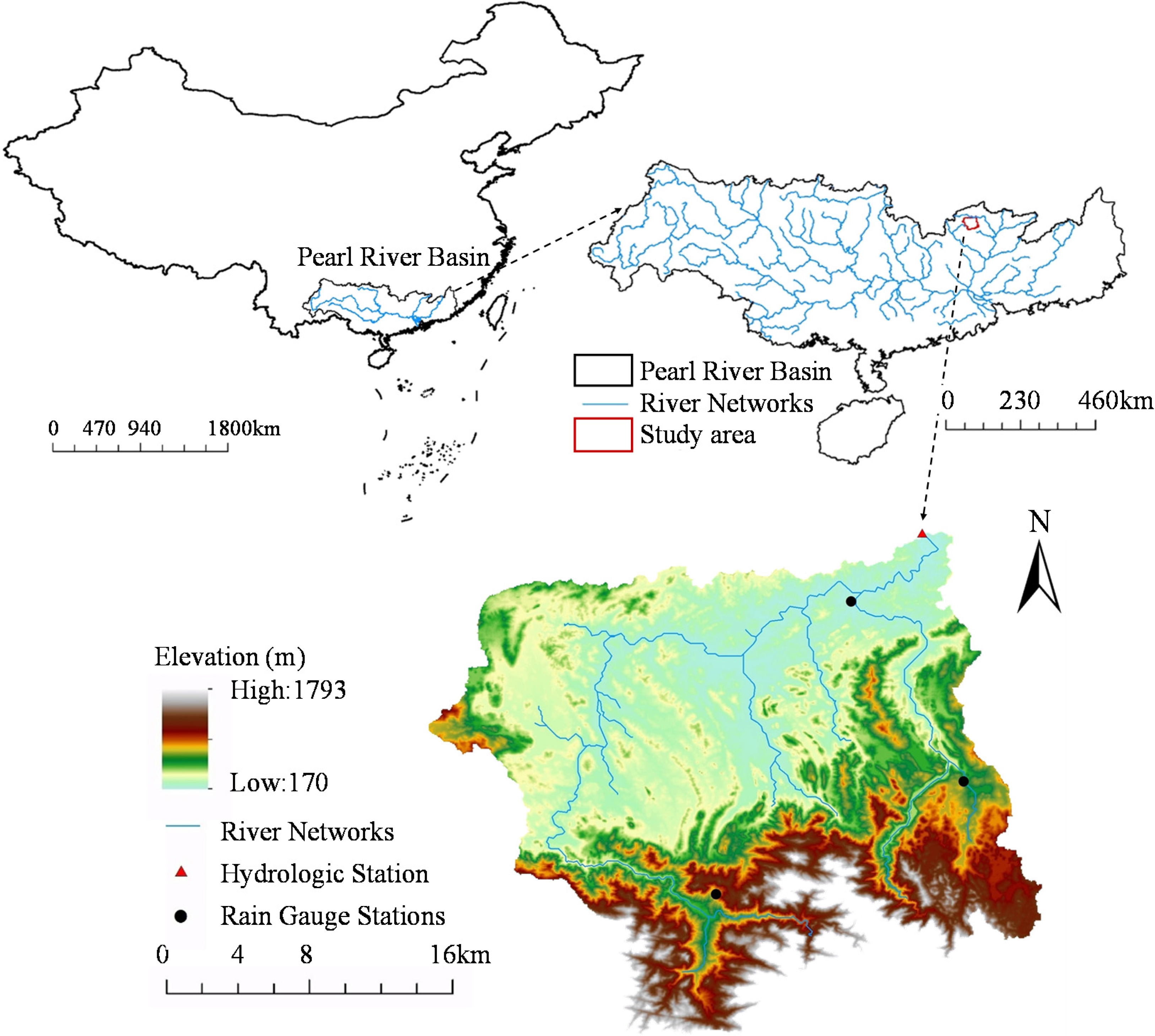 The Nanhua Creek catchment (Figure 1) is a minor tributary of the upper Pearl River in China. It is located between 112°37′ E ~ 113°05′ E and 24°53′ N ~ 25°16′ N with a drainage area of 120 km2 and a length of 82 km. The Nanhua Creek catchment belongs to the monsoon climatic zone, with cold and dry winters and hot and humid summers. The long-term mean annual precipitation in the catchment is about 1300–1500 mm, the majority of which occurs in summer. The steep slope of the catchment, combined with concentrated rainstorms, makes this area prone to flash runoff response.
