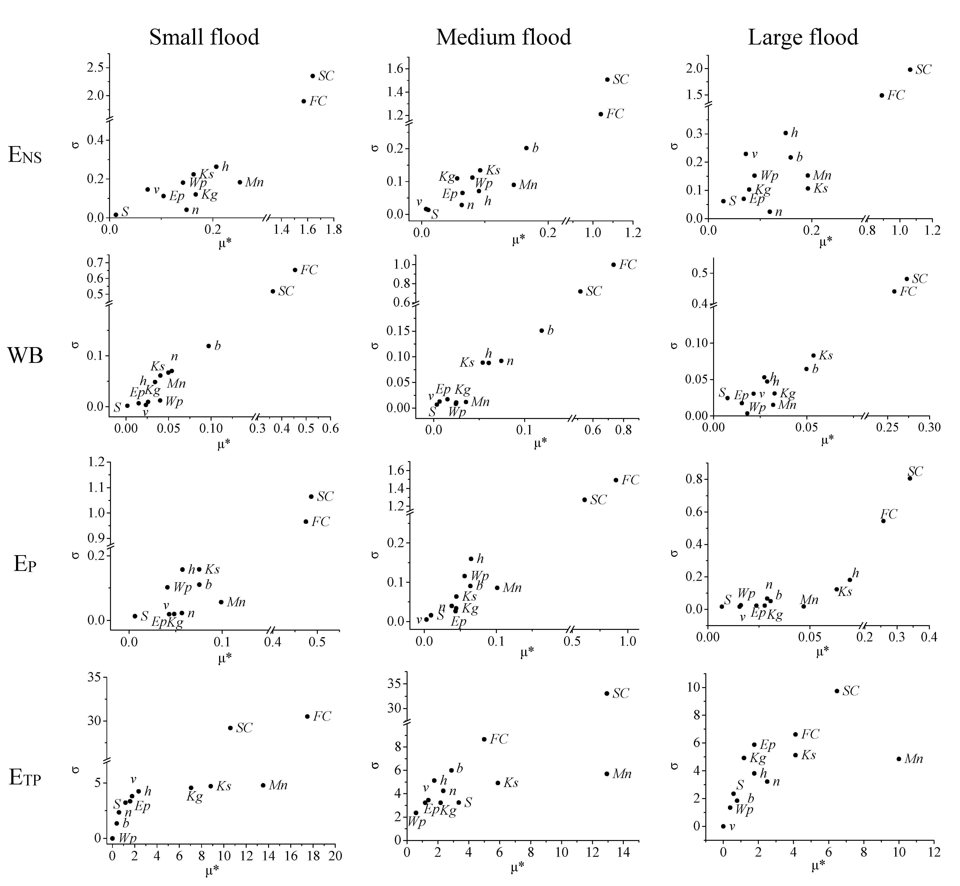 The Morris screening results can be presented in the form of ranking table [33,34], Tornado diagrams [33], and scatter plots [6]. Scatter plots are confirmed to be the most efficient and clearest with modified means as the x-axis and standard deviations as the y-axis, while the former two failed to illustrate the characteristics of standard deviations. The scatter plots of the 12 parameters in the Liuxihe model were compared in three different flood conditions as well as four different objective functions, as showed in Figure 3. On the basis of the fact that a larger value reveals higher sensitivity, it is interesting to see that even under various conditions and objective functions of interest, the sensitive rankings could all be categorized into three rough classes: highly sensitive, sensitive, and insensitive; the classified parameters also gave consistent results. Among all the parameters, SC and FC were highly sensitive; b, Mn, h, n, and Ks were sensitive; and Ep, Kg, Wp, v, and S were insensitive. Explicit ranking among the 12 parameters differed within various situations. The top sensitive parameters were found among SC, FC and Mn from the most to the least frequent. The least sensitive parameters covered were S, v, and Wp, from the most to the least frequent. Our results were in accordance with those of Xu et al. [54], who stated that SC and FC were first-rate; h and b were second-rate; Wp, n, and Ks were third-rate; and S, Ep, Mn, Kg, and v were insensitive.