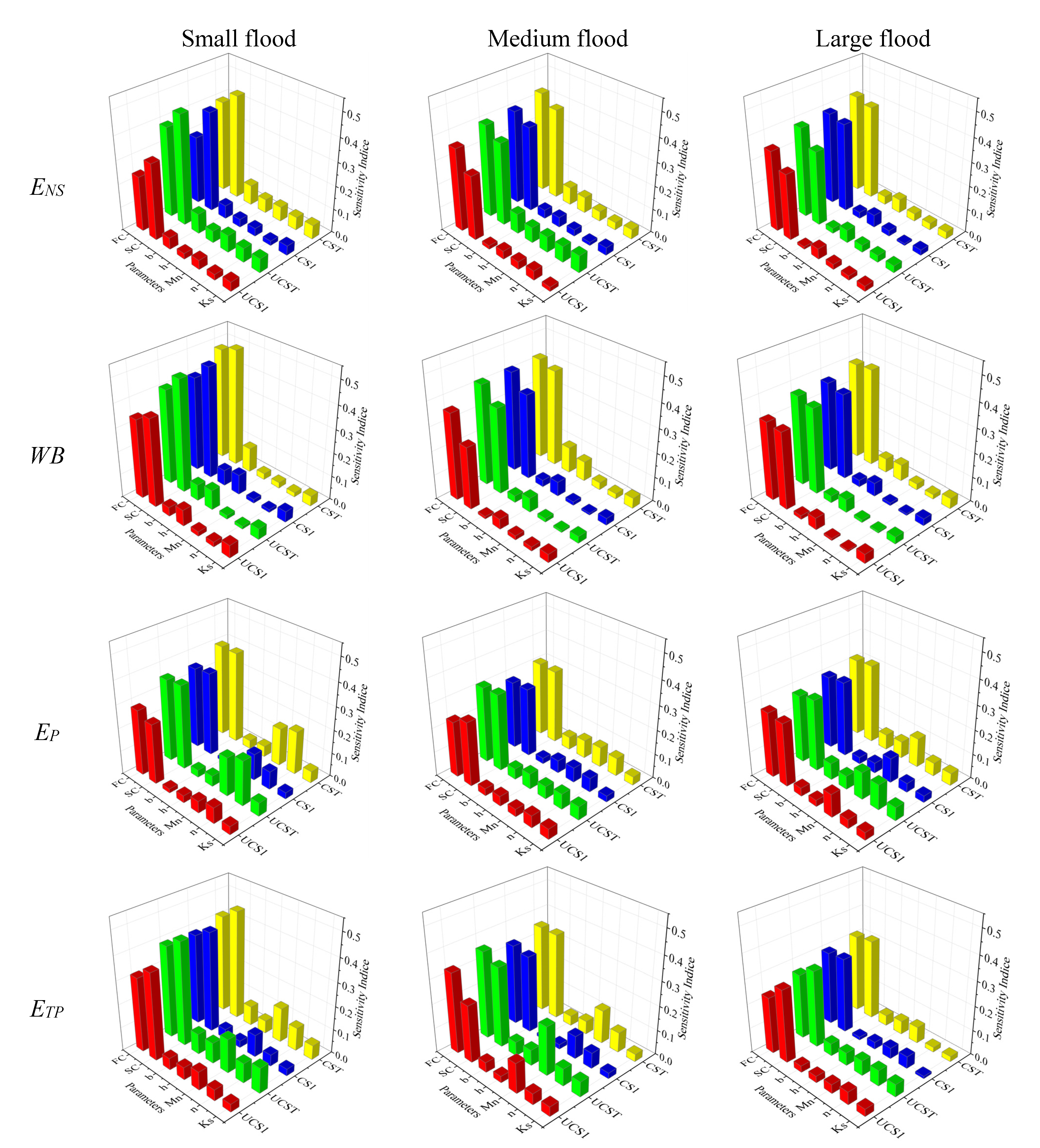 - For both uncorrelated and correlated parameters, the classification of parameters as first or total order sensitivity indices was affected neither by the choice of objective functions nor by the selection of different flood magnitudes. FC and SC are highly sensitive parameters and the remaining five parameters are sensitive. Meanwhile, the ranking of parameters sensitivity indices was greatly determined by the various objective functions specified and particular flood magnitudes stated. Due to the distinctive antecedent watershed conditions inducing different tolerance to watershed disturbances, the sensitivity indices for small floods were relatively higher than those for large floods. With regard to specific objective functions, flow concentration parameters such as n and Mn had a greater effect on EP and ETP than WB, whereas runoff generation parameters such as Ks, b, and b display totally reversed consequences. Hydrological models behave and respond uniquely to various evaluation functions and application conditions.
