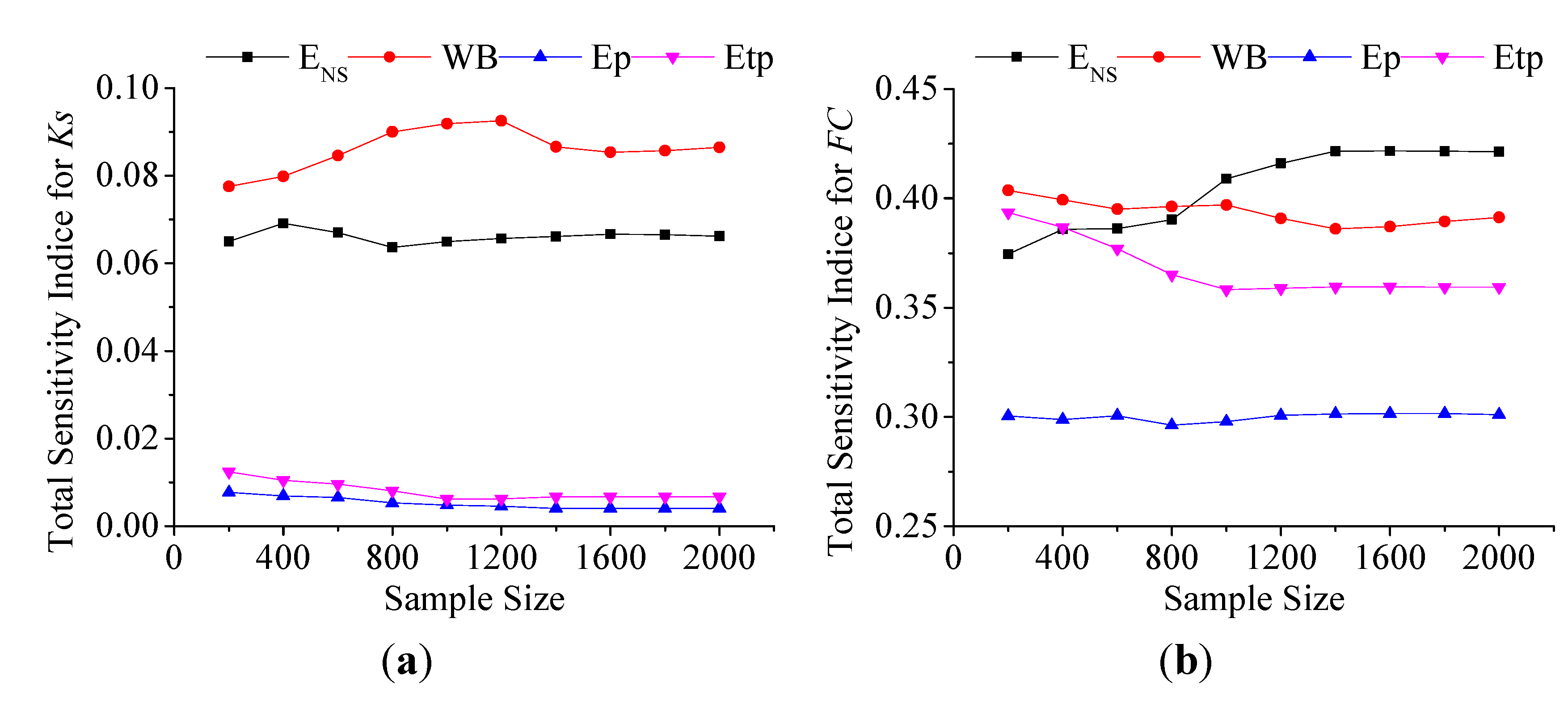 In this study, further insight of the second order indices between the seven parameters without consideration of correlation relationship was also illustrated. Table 5 showed that the sum of the first order sensitivity indices of these seven parameters was less than 1. Zhan et al. [6] explained that the sum of first order indices less than 1 was caused by the interactive effects among parameters, which could not be considered in the single parameter sensitivity analysis. In addition, this outcome indicated that the interactive impacts among parameters cannot be neglected. This indication was reinforced by the gaps between the first and total order sensitivity indices (see Figure 4 and Table 5). On the other hand, the sum of total order sensitivity indices was slightly larger than 1. This phenomenon was explained by Tang et al. [14]: the truncation and Monte Carlo integration implemented in the Sobol’ method can result in slight numerical errors. However, Tang et al. [14] acknowledged that this unimportant error would not affect the sensitivity ranking of parameters. Baroni and Tarantola [57] also investigated the robustness of sensitivity indices under the change of sample size. The total order sensitivity indices proved to be more stable than the first order ones. Therefore, the total order sensitivity indices of the most and least sensitive parameters (i.e., FC and Ks) were iteratively explored by increasing the sample size by 200 at a time from 200 to 2000. Results in Figure 5 showed that both total order sensitivity indices of Ks (left) and FC (right) fluctuated within a wide range when the sample size was less than 1200. Furthermore, the variation of highly sensitive parameters was more significant than that of sensitive parameters. The total sensitivity indices of Ks with EP and ETP as objective functions were seen to converge at a very low computation cost. Even though the total sensitivity indices changed more significantly when taking ENS and WB as objective functions, the differences between the maximum and minimum were 0.006 and 0.015 for Ks, respectively. However, from the perspective of FC, only when taking EP as objective function did the total sensitivity indice vary slightly, and the differences between the maximum and minimum values were 0.047, 0.018, and 0.035 for ENS, WB, and ETP, respectively, which were much larger than those of Ks. These results were in consistent with the research of Baroni and Tarantola [57]. However, as long as the sample size increased to a large value, e.g., 1600, the total sensitivity analysis began to converge and generate steady results for both highly and generally sensitive parameters considering various objective functions. These results underlined that the sample size of 2000 set in the Sobol’ analysis in Section 4.4 was reasonable.