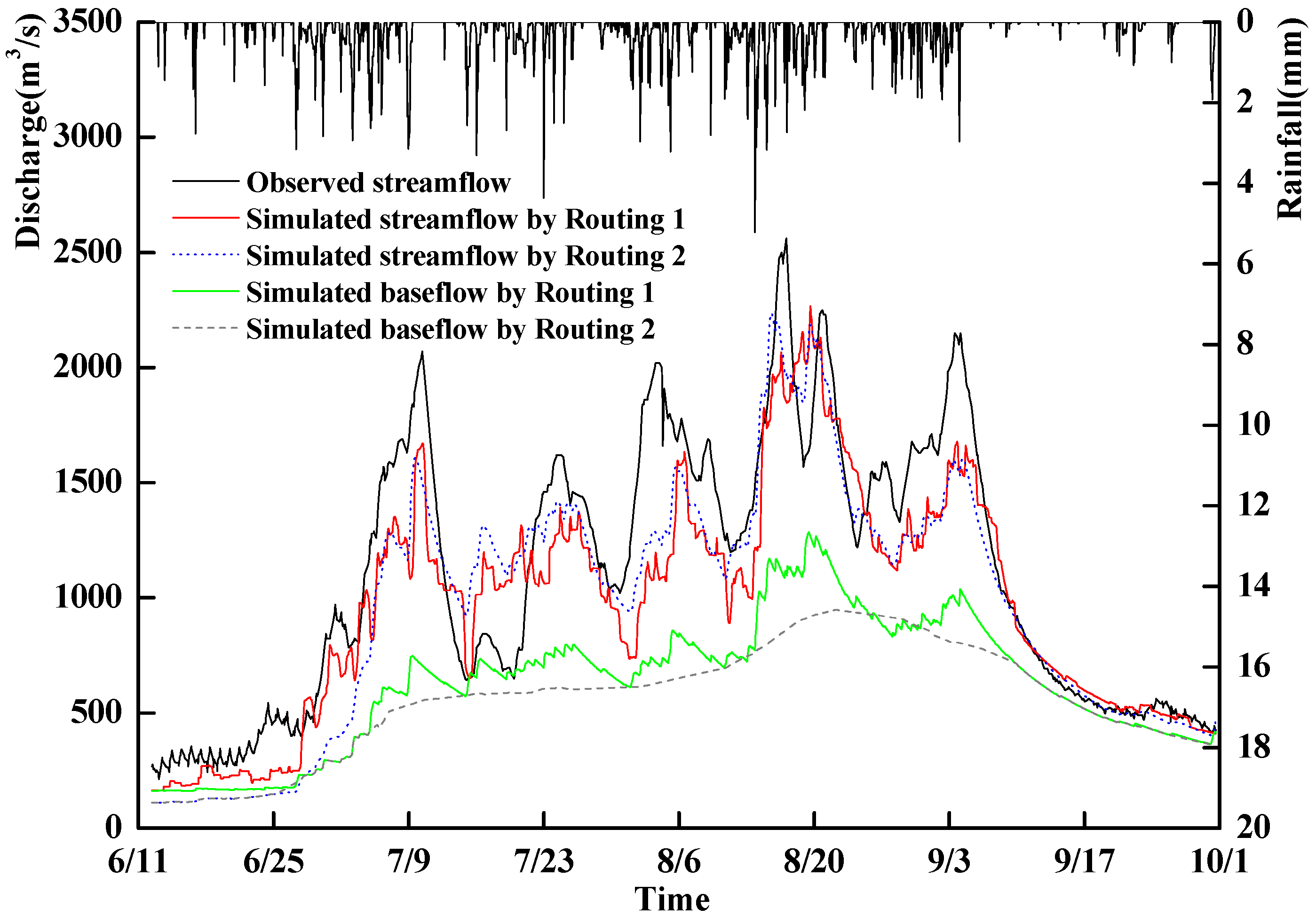 | Period | Year | Observed Peak Flow | Simulated Peak Flow by Routing 1 | Simulated Peak Flow by Routing 2 | |||||