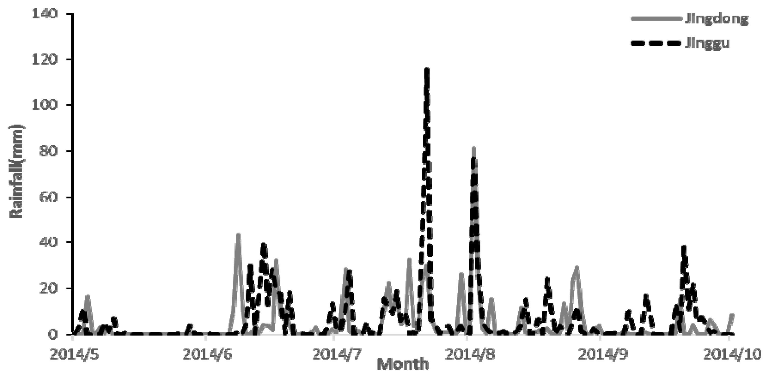 Rainfall curves of Jingdong and Jinggu during the flood season.