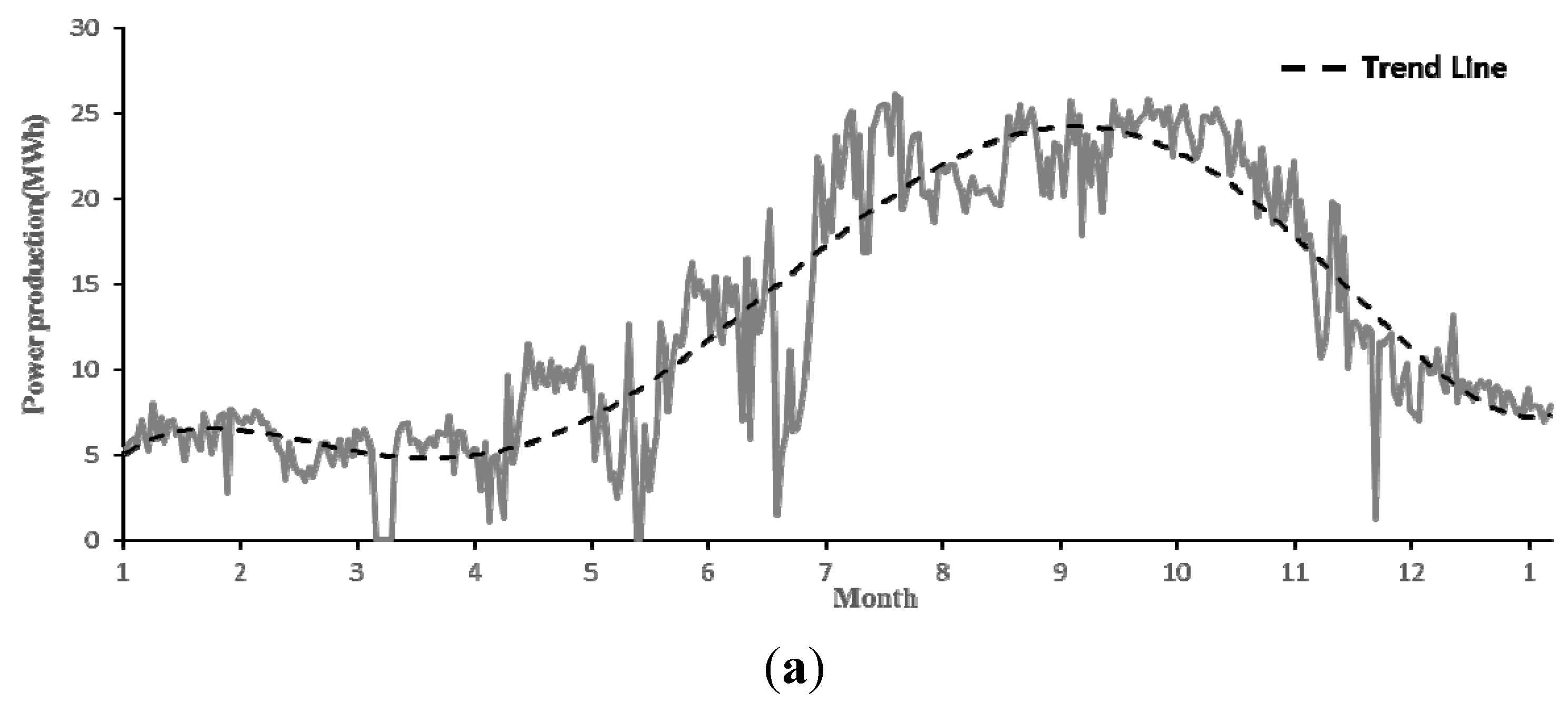 SHP plants in the same region have some similarities in terms of hydrological and meteorological conditions. As shown in Figure 3, the generation data are different in terms of the degree of smoothing between a single SHP plant and all of the SHP plants in the same region. However, the change trend of generation data during the year is essentially the same as the two-trend line shown in Figure 3. In other words, there is a similarity between the single SHP plant and the regional integrity.