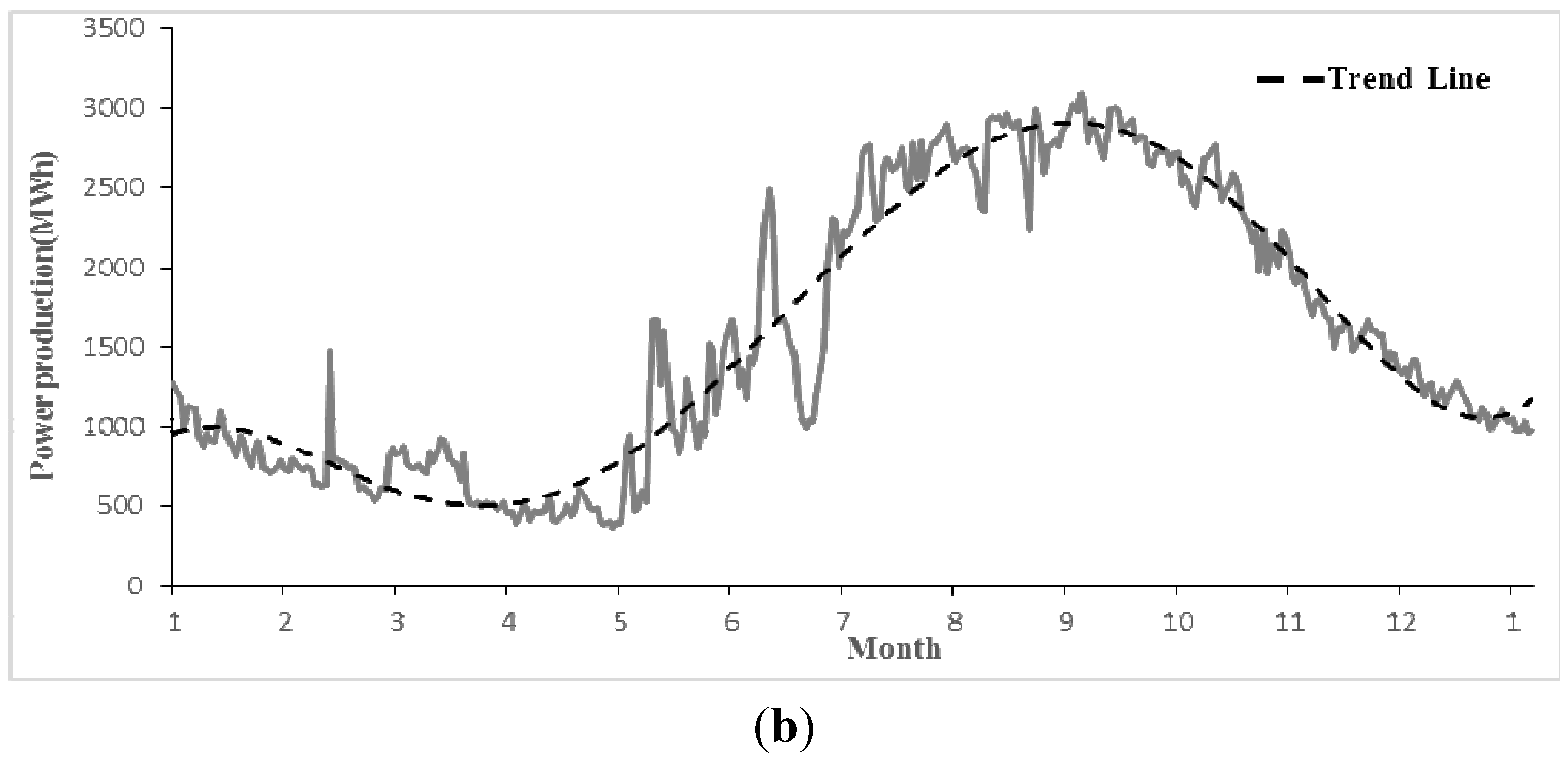 Power production curve and its tread line of SHP plant (a) Monthly power production and trend line of single SHP plant; (b) Monthly power production and trend line of SHP plants in county.