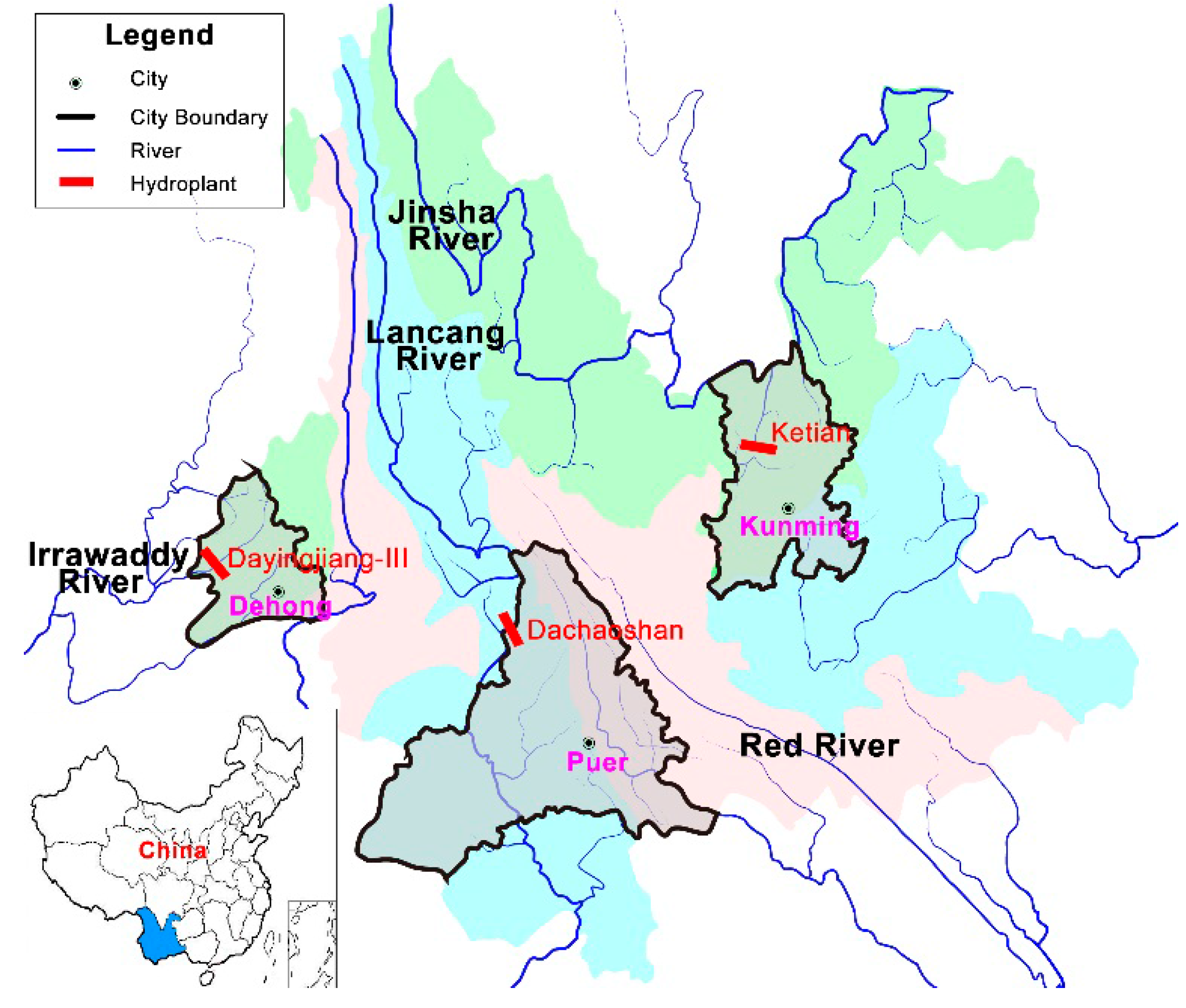 Map of typical basins, prefectures and large-medium hydropower (LHP) plants in Yunnan Province.