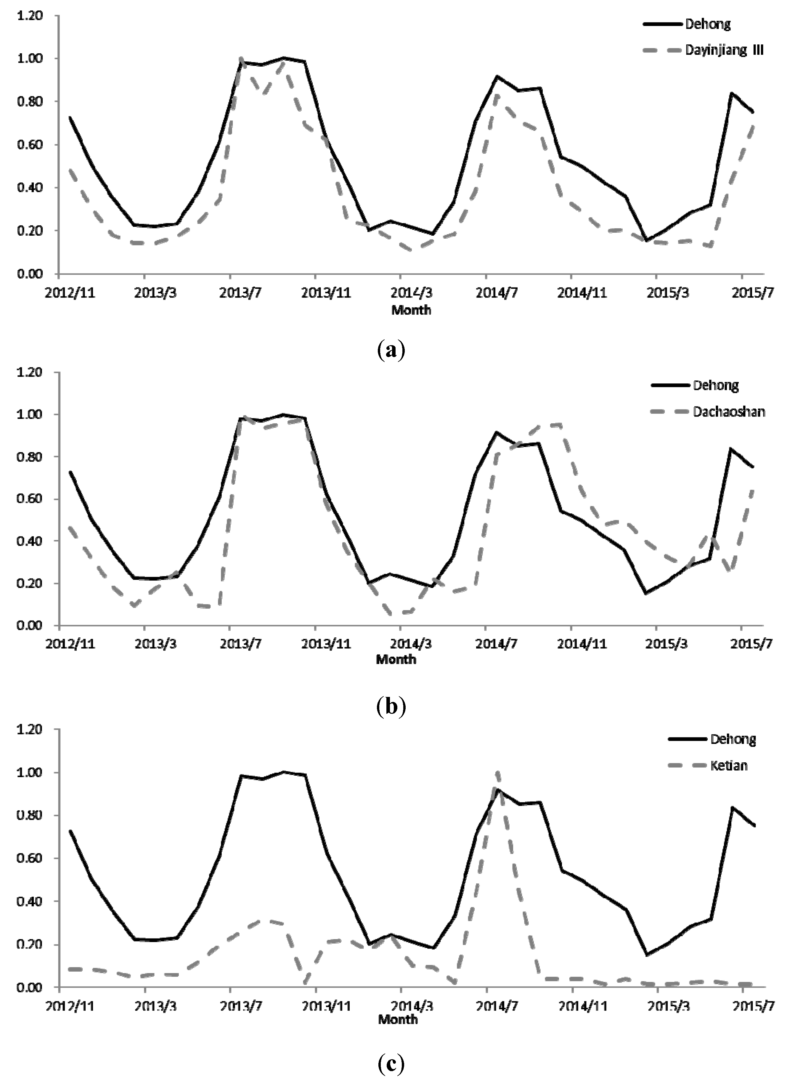 Normalized trend of power production of SHP plants in Dehong and interval flow of the LHP plant. (a) Trend Chart of SHP plants in Dehong and Dayingjiang III hydropower plant; (b) Trend Chart of SHP plants in Dehong and Dachaoshan hydropower plant; (c) Trend Chart of SHP plants in Dehong and Ketian hydropower plant.