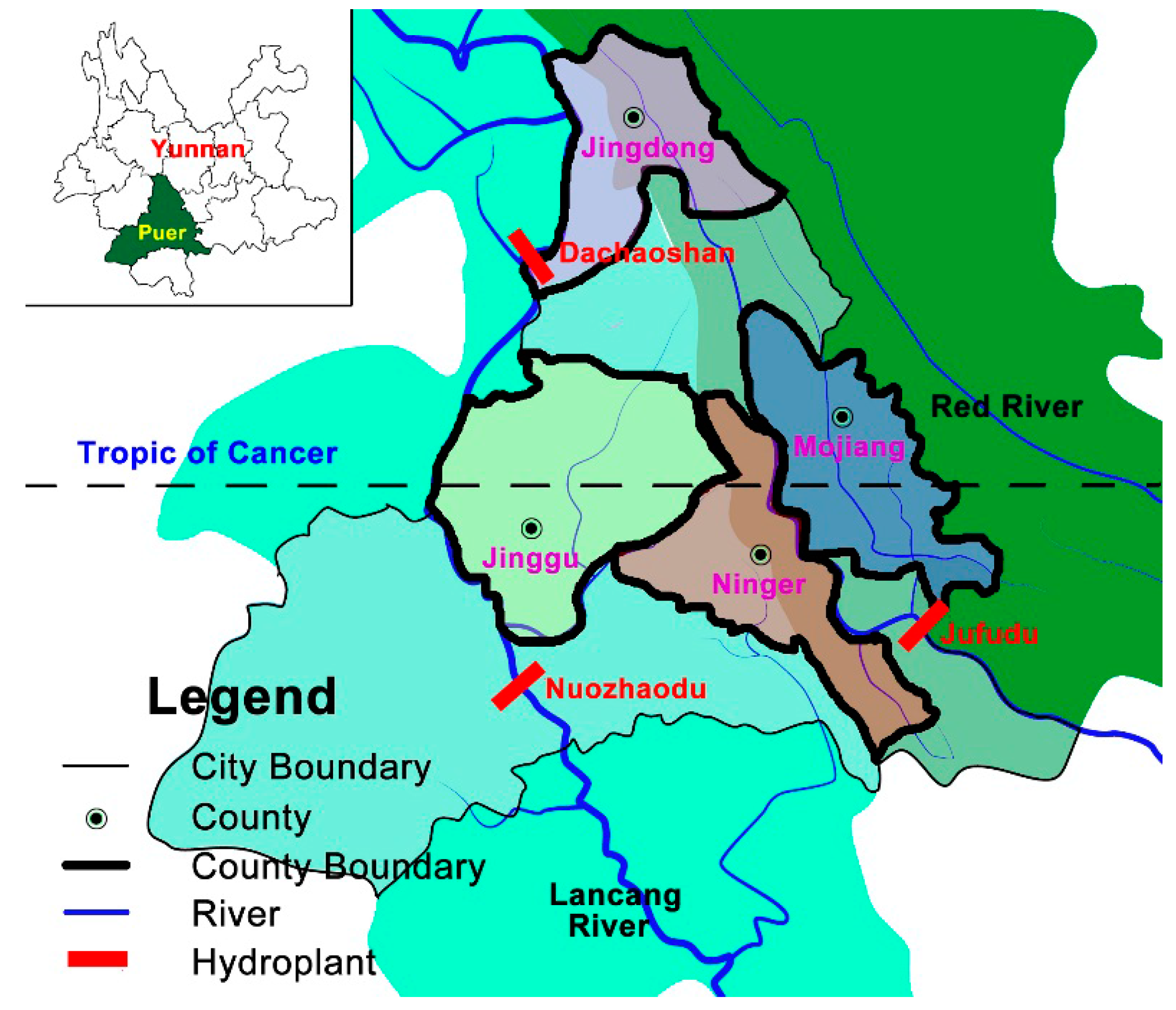 To demonstrate the correlation between SHP and LHP plants in a county, Puer was selected as an example, as two river basins flow into this region (Figure 6). Puer is located in southwestern Yunnan and is affected by subtropical monsoon climate, with mountainous area accounting for 98.3% of the total areas, and the Tropic of Cancer pass through its center. Affected by terrain and altitude, the vertical differences in Puer are obvious. Separated by Mount Wuliang, the eastern region of Puer is the Red-River Basin and the western region is the Lancangjiang Basin. In this section four counties were chosen as examples: Jingdong, Jinggu, Ninger and Mojiang.