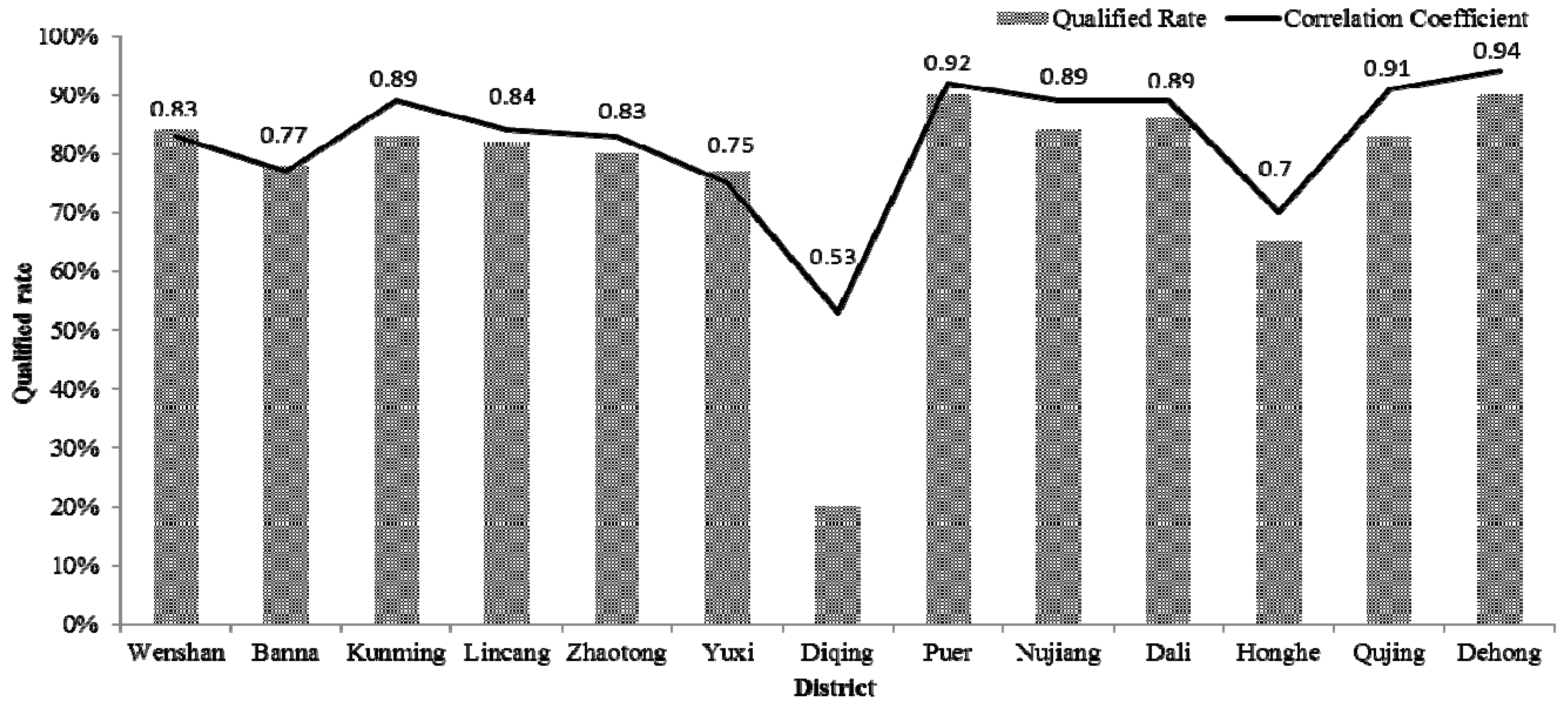 (3) As the power production of SHP plants shows similarity of regions, the difference of the correlation in different counties (maybe in the same district) is less than that in different districts.