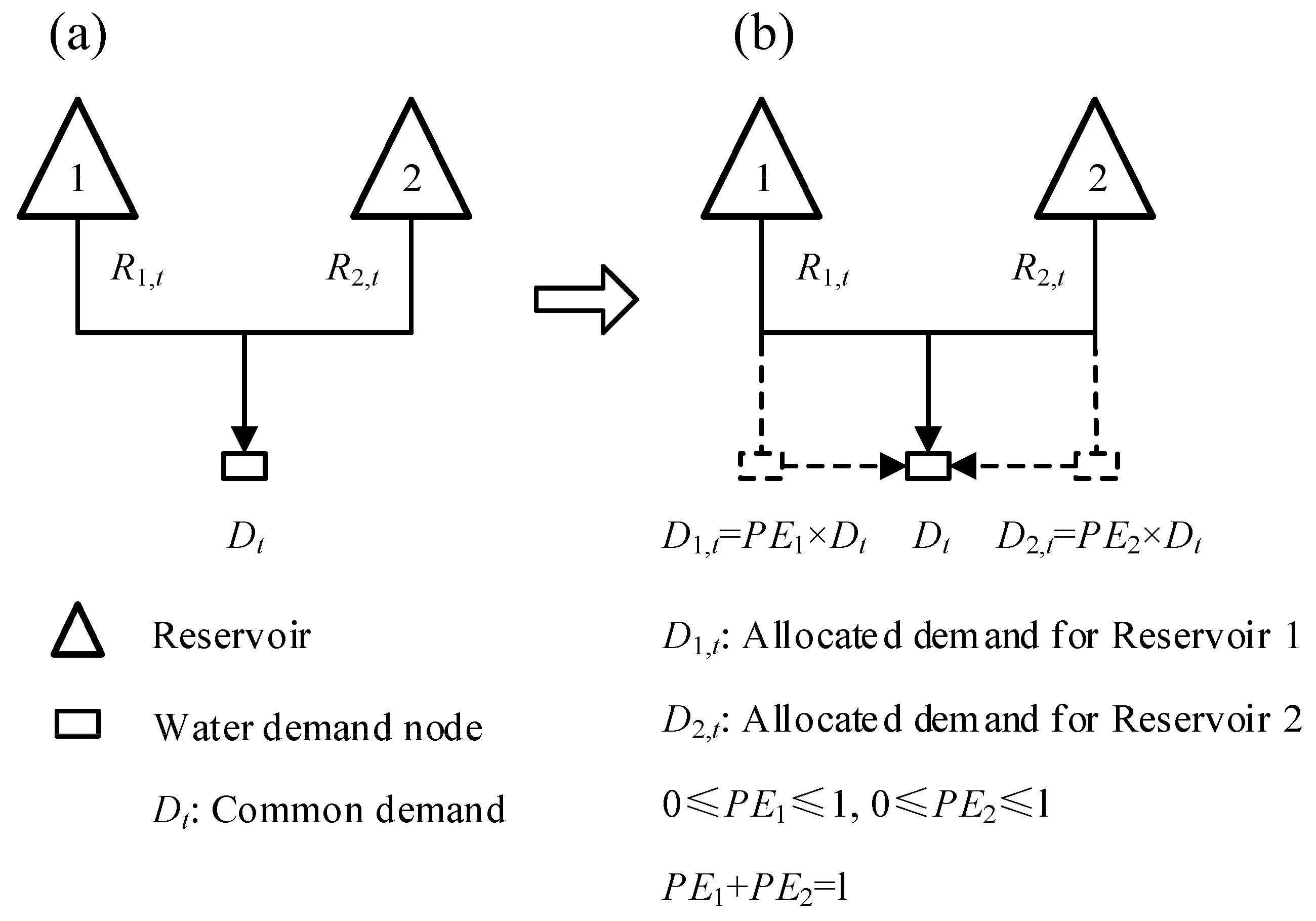 (a) The parallel two-reservoir system; (b) allocation policy of common water demand.