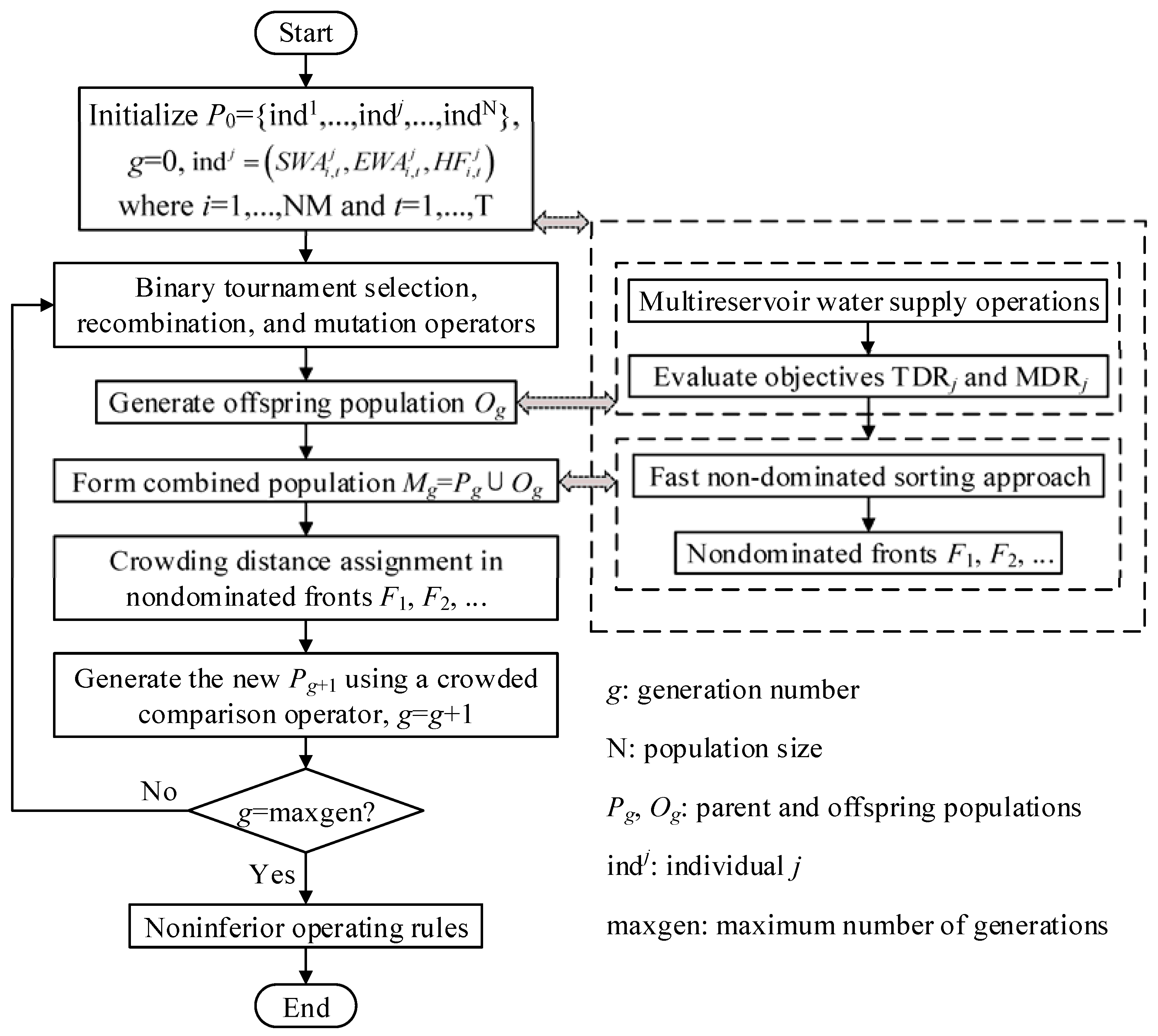 The NSGA-II, developed by Deb et al. [20], is one of the most efficient and steady population-based MOEAs and has been widely reported by various investigators in solving water resource systems-related problems. Some recent applications are: parameter calibration of hydrologic models [21,22], optimal design and management of flood control on watershed scale [23,24], reservoir systems optimization [14,25,26,27], and extraction of optimal operation policies [13]. Figure 3 shows the flowchart of applying the NSGA-II to derive a noninferior set of operation rules for a multireservoir water supply system. The main steps are summarized as follows: