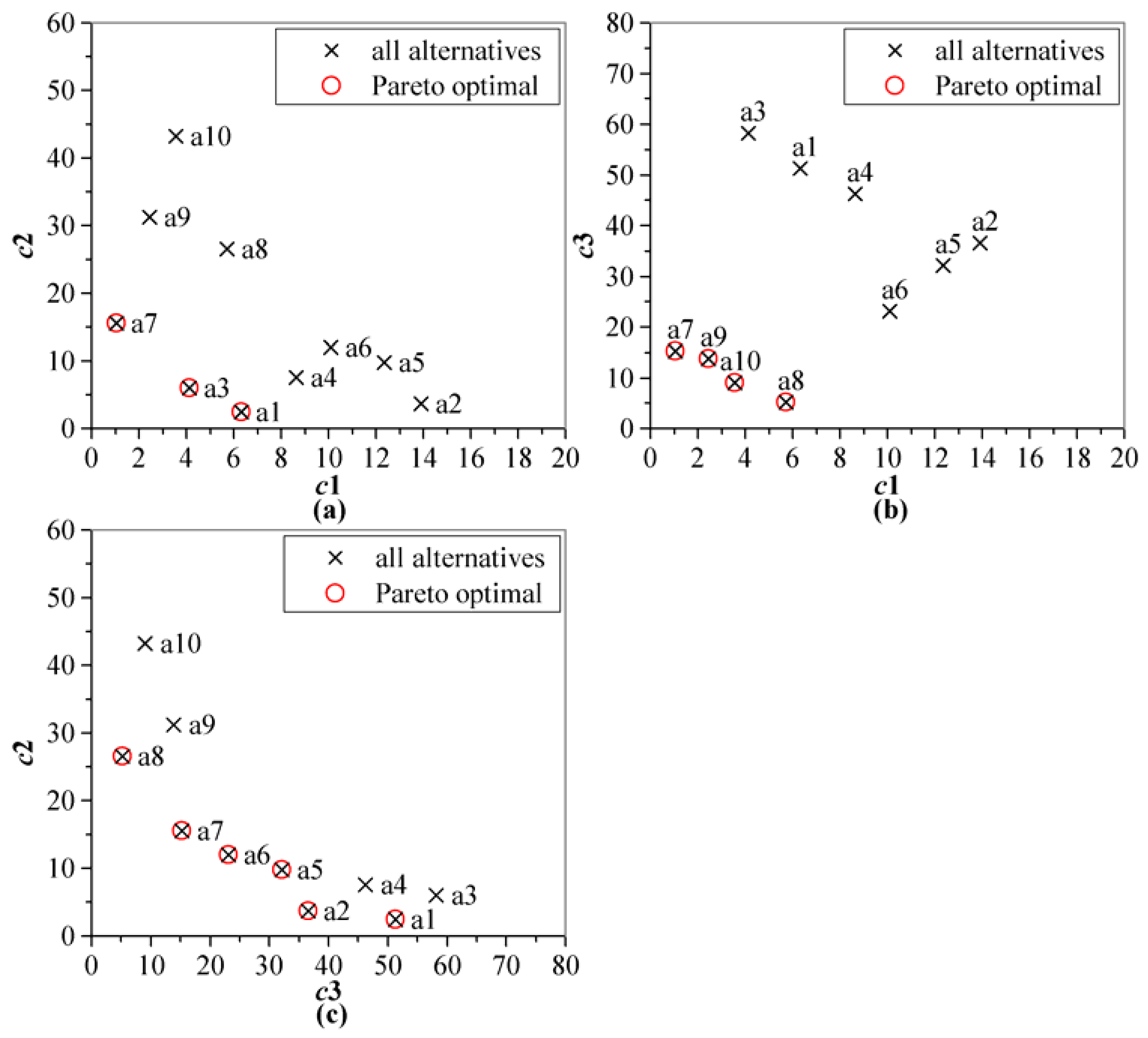 Table 1 shows a set of 10 design alternatives (a1–a10) in a three-dimensional criterion space C = (c1–c3) as a numerical illustration, where c1–c3 are minimized. It can be clearly seen from Table 1 that all 10 design alternatives are 3-Pareto-optimal because no one can fully dominate the others. For example, the values of criteria c1 and c2 for a2 are both larger than those of a1, but the value of criterion c3 of a2 is lower than that of a1, which indicates that neither a1 or a2 dominates the other totally. Figure 4 plotted the alternatives from Table 1 in two-dimensional criterion subspace for the possible combinations of any two of the three criteria in C. In Figure 4, alternatives surrounded by circles are Pareto-optimal in their respective two-dimensional criterion subspace. As can be seen from Figure 4a, a1, a3, and a7 are on the Pareto front of criteria c1 versus c2; criteria c1 versus c3 in Figure 4b has four 2-Pareto-optimal alternatives (a7–a10); c3 versus c2 in Figure 4c has six 2-Pareto-optimal alternatives (a1, a2, a5–a8). Through the analysis, kmin = 3, pmax = 3, a7 is the most preferred choice.