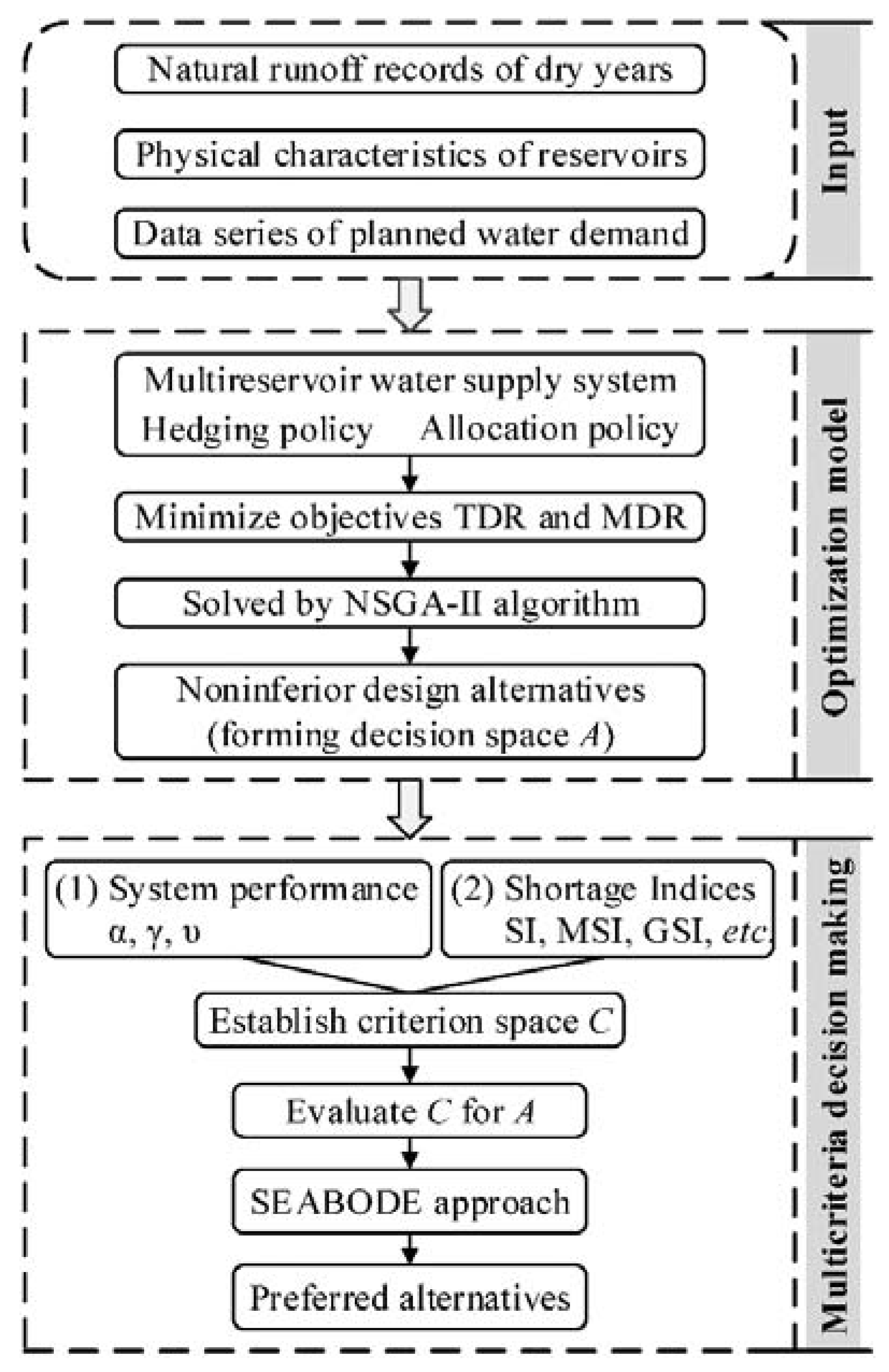 As shown in Figure 5, application of the proposed methodology to determine the optimal operation rules for a multireservoir water supply system in dry years is manipulated according to the following three steps: (1) an input module (a process of data preparation); (2) an optimization model using the NSGA-II algorithm to derive a number of noninferior hedging policies in terms of objectives TDR and MDR, which forms the decision space A; (3) a MCDM procedure to further select the most preferred alternatives according to criterion space C and the SEABODE approach.