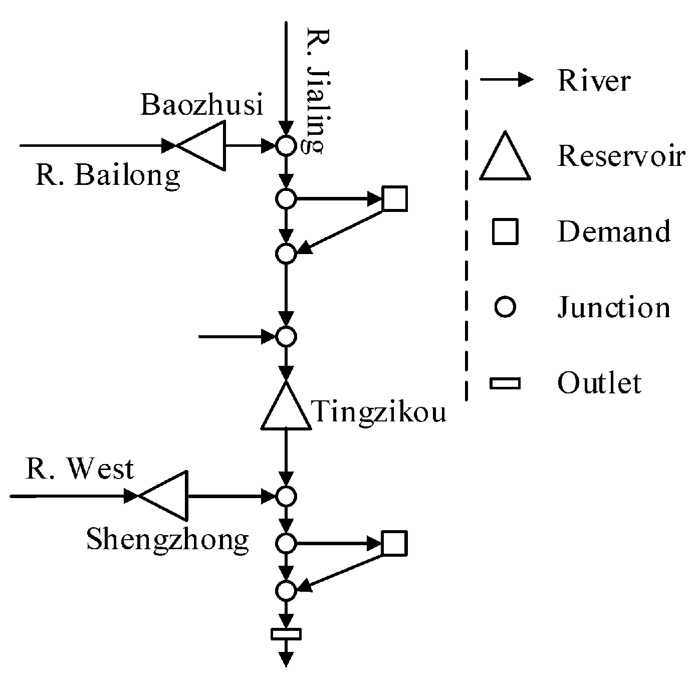 Jialing River is a major tributary of the Yangtze River in China. A regional water supply system with three reservoirs (Baozhusi, Tingzikou, and Shengzhong) located in the upper and middle reaches of the Jialing River is employed as a case study. Figure 6 is the layout of the investigated system. As shown in Figure 6, Tingzikou is a leading water conservancy project in the mainstream of the Jialing River; Baozhusi and Shengzhong are two smaller reservoirs in tributaries, Bailong River and West River, respectively. Some critical parameters of the three reservoirs are listed in Table 2. The flood season is concentrated from June to August.