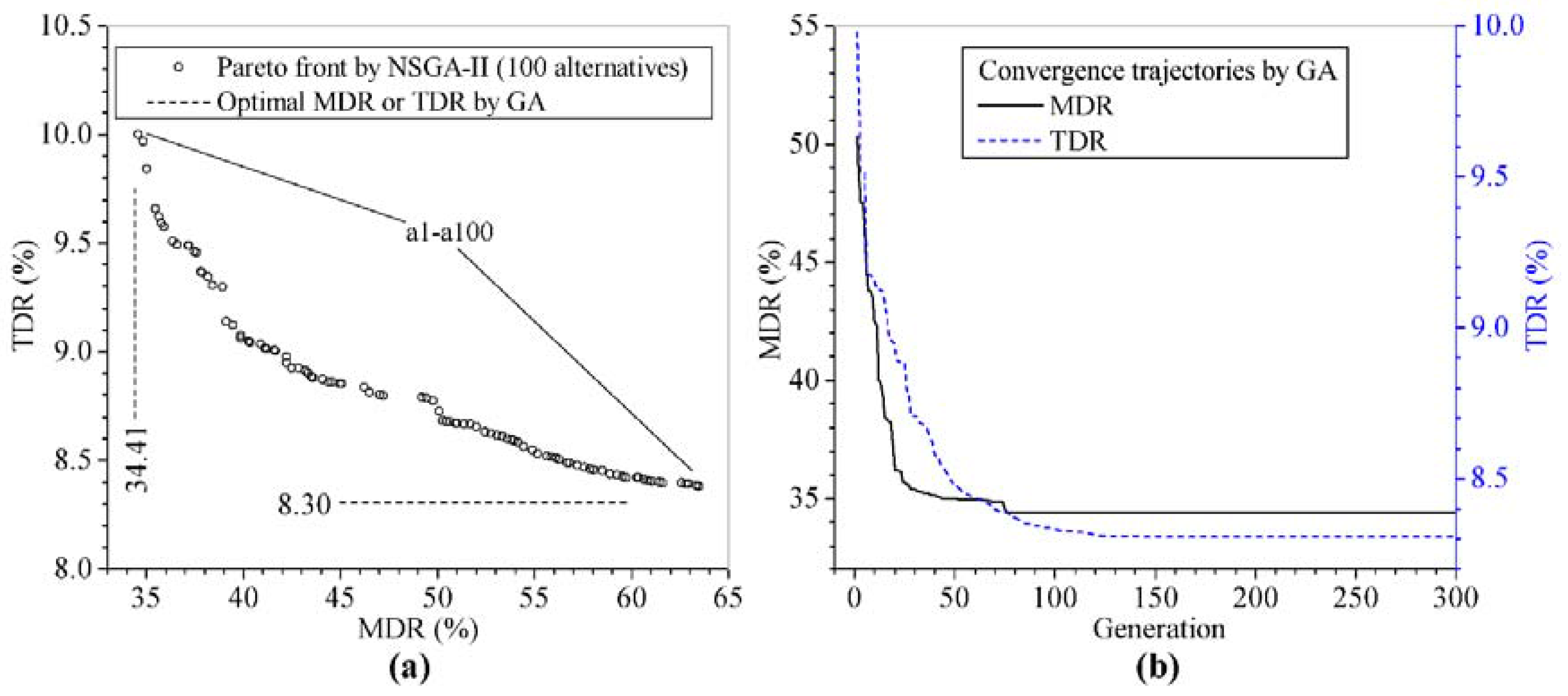 The Pareto front or the decision space A, derived by the NSGA-II algorithm, contains 100 feasible design alternatives (a1, ..., a100) that are well-distributed in the area from 8.38% to 10.00% for TDR, and from 34.59% to 63.50% for MDR, as shown in Figure 8a. The extreme values of TDR and MDR obtained by optimizations of single-objective GA are 8.30% and 34.41%, respectively, and Figure 8b gives corresponding convergence trajectories.