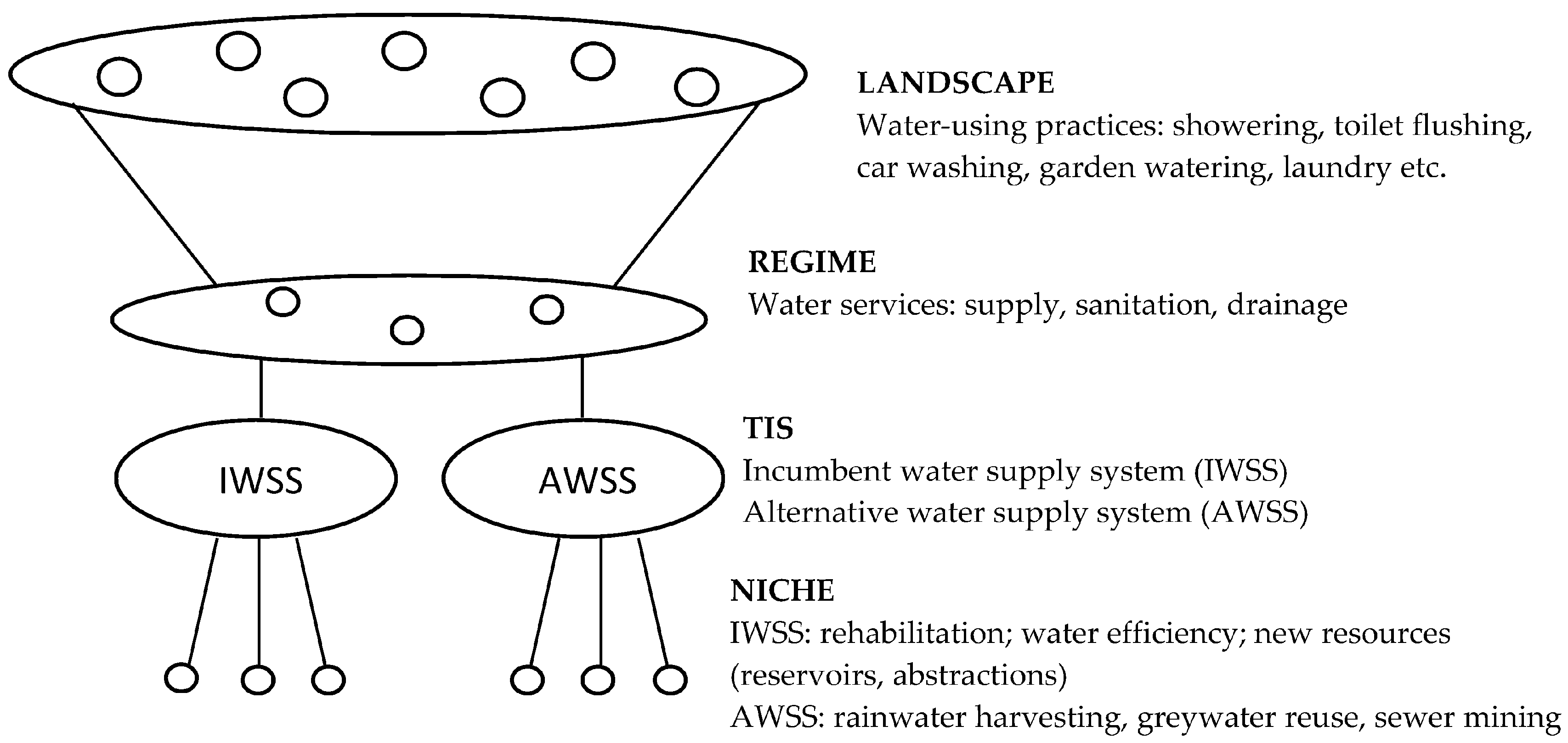 The multi-level perspective (landscape, regime, niche) and corresponding technological innovation systems (TIS) for the water sector.
